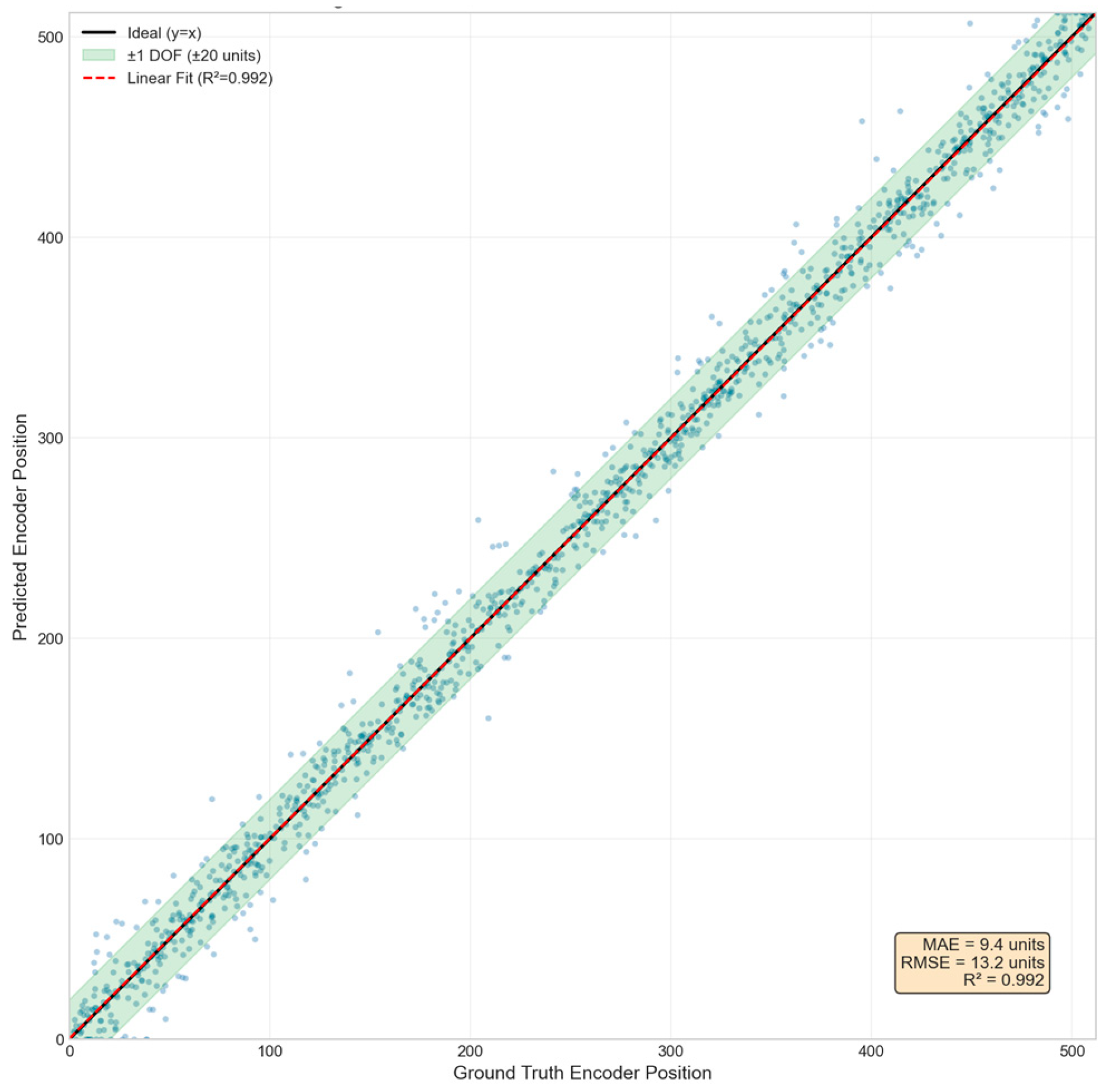 - Prediction Error within 95% Confidence Interval: ≤18 encoder units