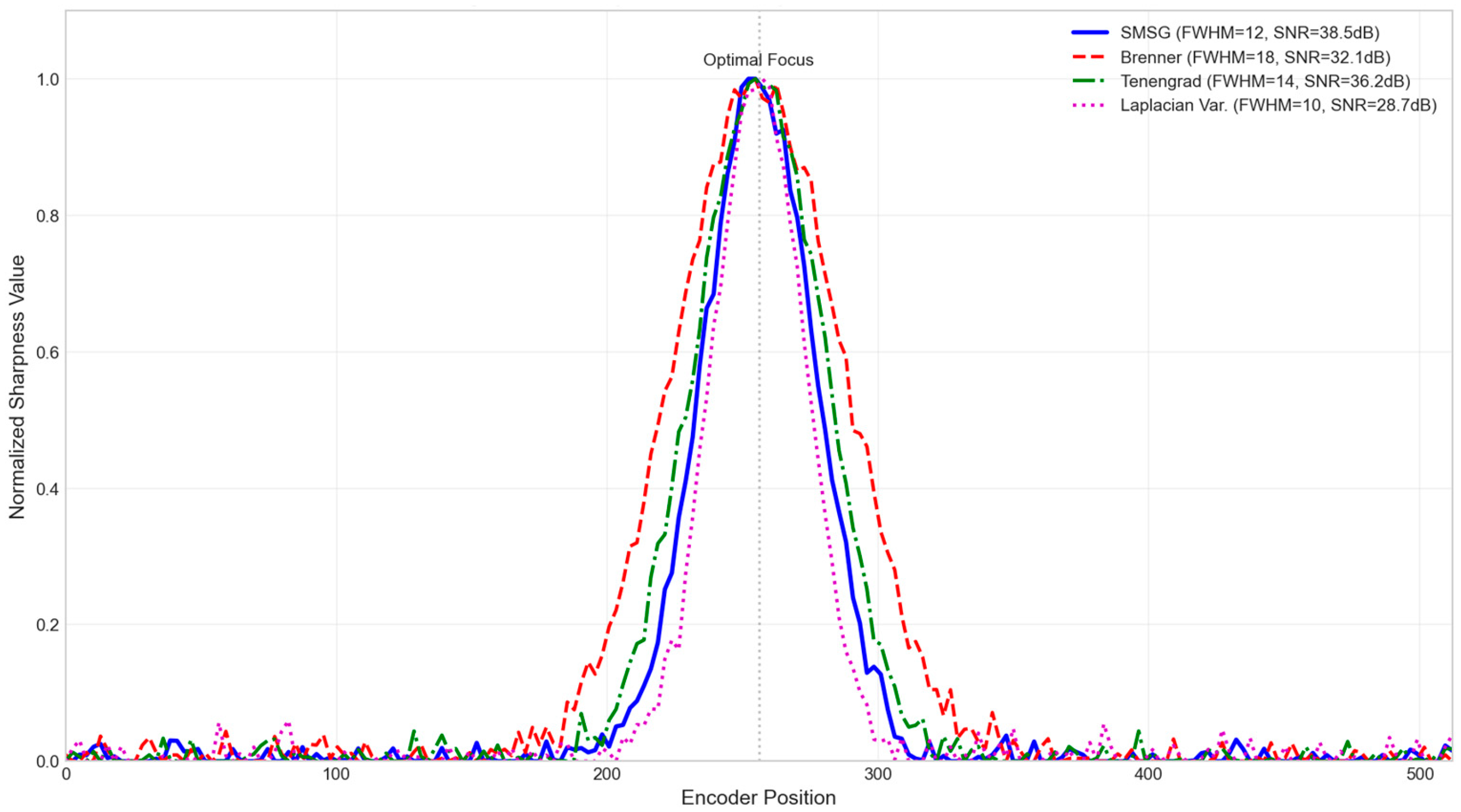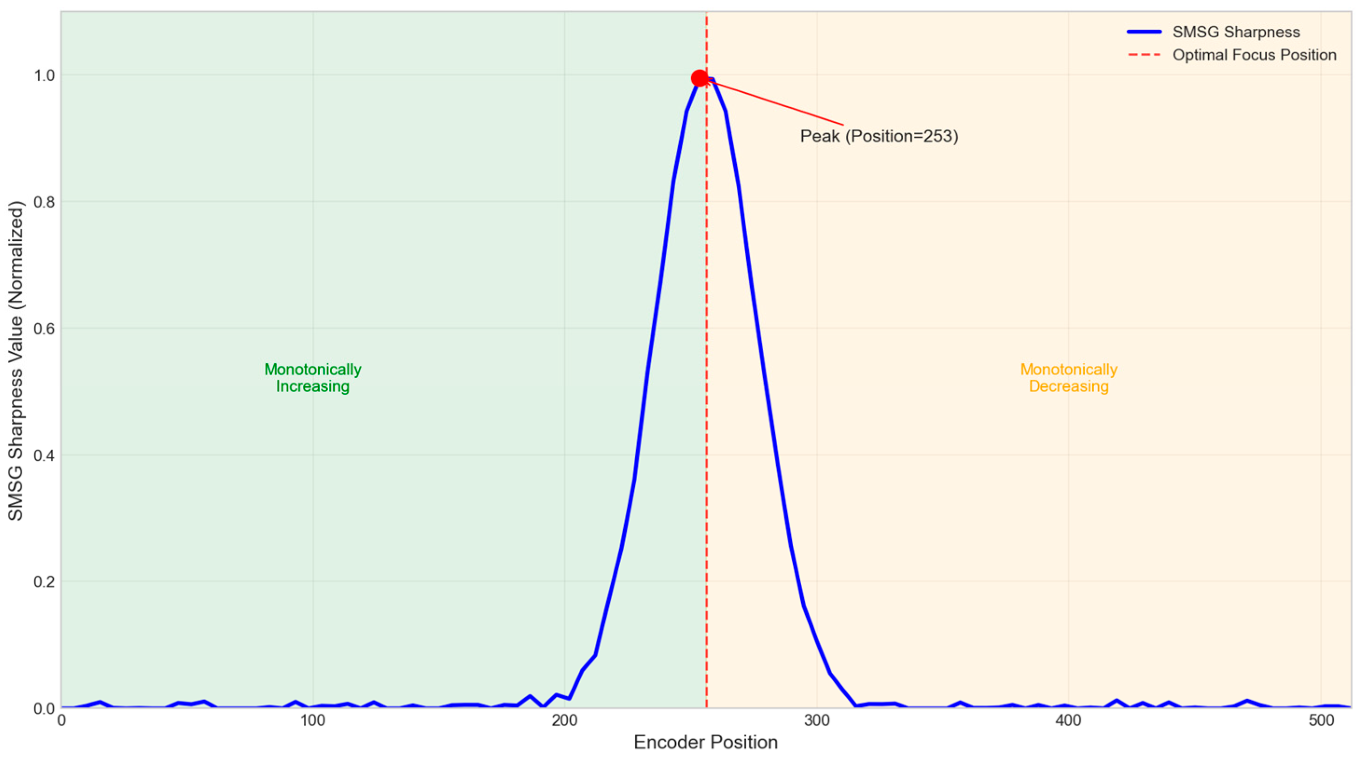 2. Sharpnessprev ← ComputeSMSG(CaptureImage(Pcurrent)) 3. Sharpnessmax ← Sharpnessprev 4. Pbest ← Pcurrent 5. direction ← -1 // Initially search in the direction of decreasing encoder value 6. step ← Sfine 7. iteration ← 0 8. WHILE iteration < Nmax DO 9. Pnext ← Pcurrent + direction × step 10. IF Pnext < 0 OR Pnext > 512 THEN 11. direction ← -direction // Reverse direction at boundary 12. CONTINUE 13. END IF 14. 15. Sharpnesscurrent ← ComputeSMSG(CaptureImage(Pnext)) 16. ΔSharpness ← (Sharpnesscurrent-Sharpnessprev)/Sharpnessprev 17. 18. IF Sharpnesscurrent > Sharpnessmax THEN 19. Sharpnessmax ← Sharpnesscurrent 20. Pbest ← Pnext 21. END IF 22. 23. IF ΔSharpness < -ε THEN // Sharpness decline detected, peak passed 24. BREAK // Proceed to the super-fine stage 25. ELSE IF |ΔSharpness| < δ THEN // Sharpness change is flat 26. step ← step × α // Reduce step size 27. IF step < 1 THEN step ← 1 END IF 28. END IF 29. 30. Sharpnessprev ← Sharpnesscurrent 31. Pcurrent ← Pnext 32. iteration ← iteration + 1 33. END WHILE 34. RETURN Pbest, Sharpnessmax |