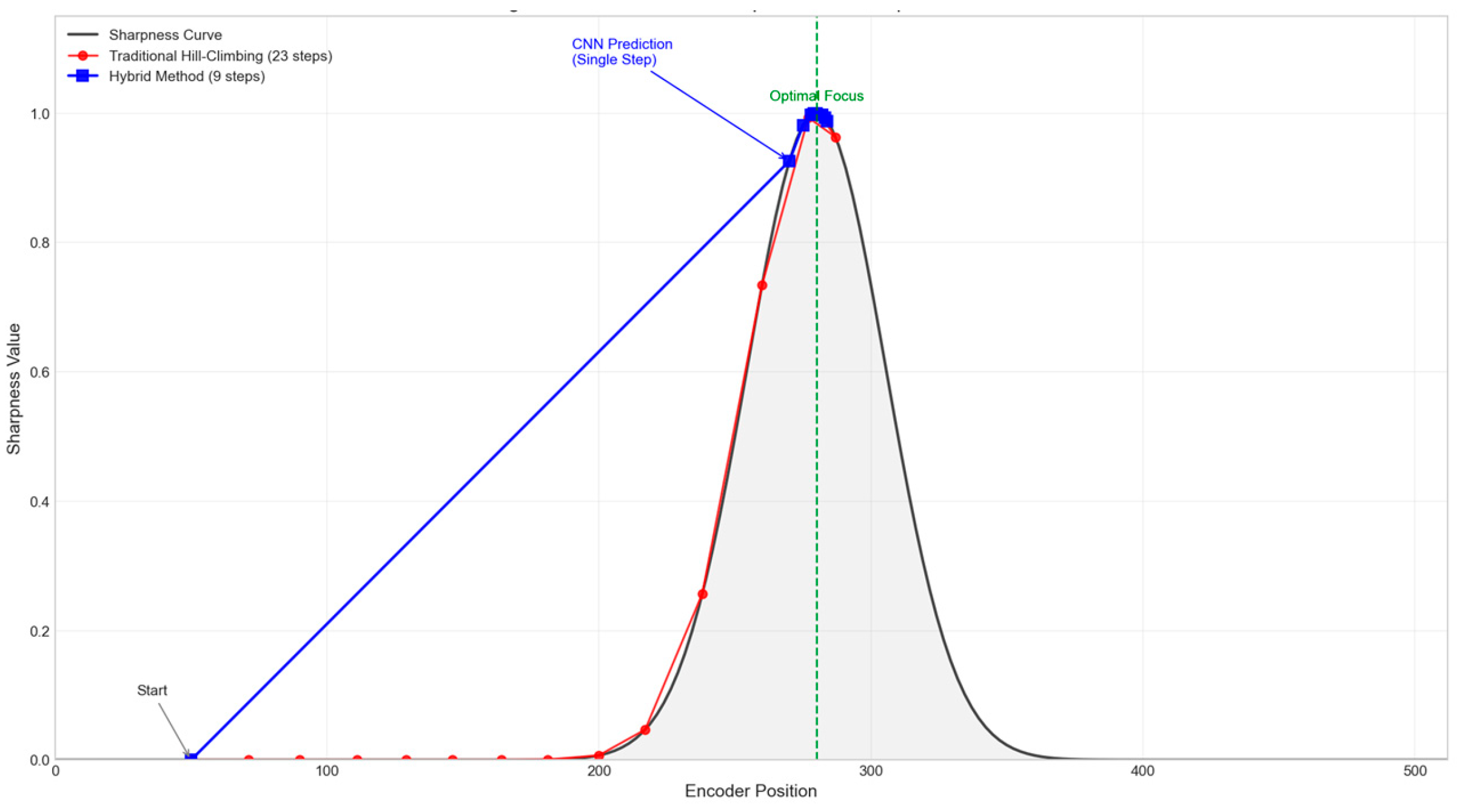 - Configuration C: The proposed hybrid method (CNN coarse focusing + hill-climbing fine search)