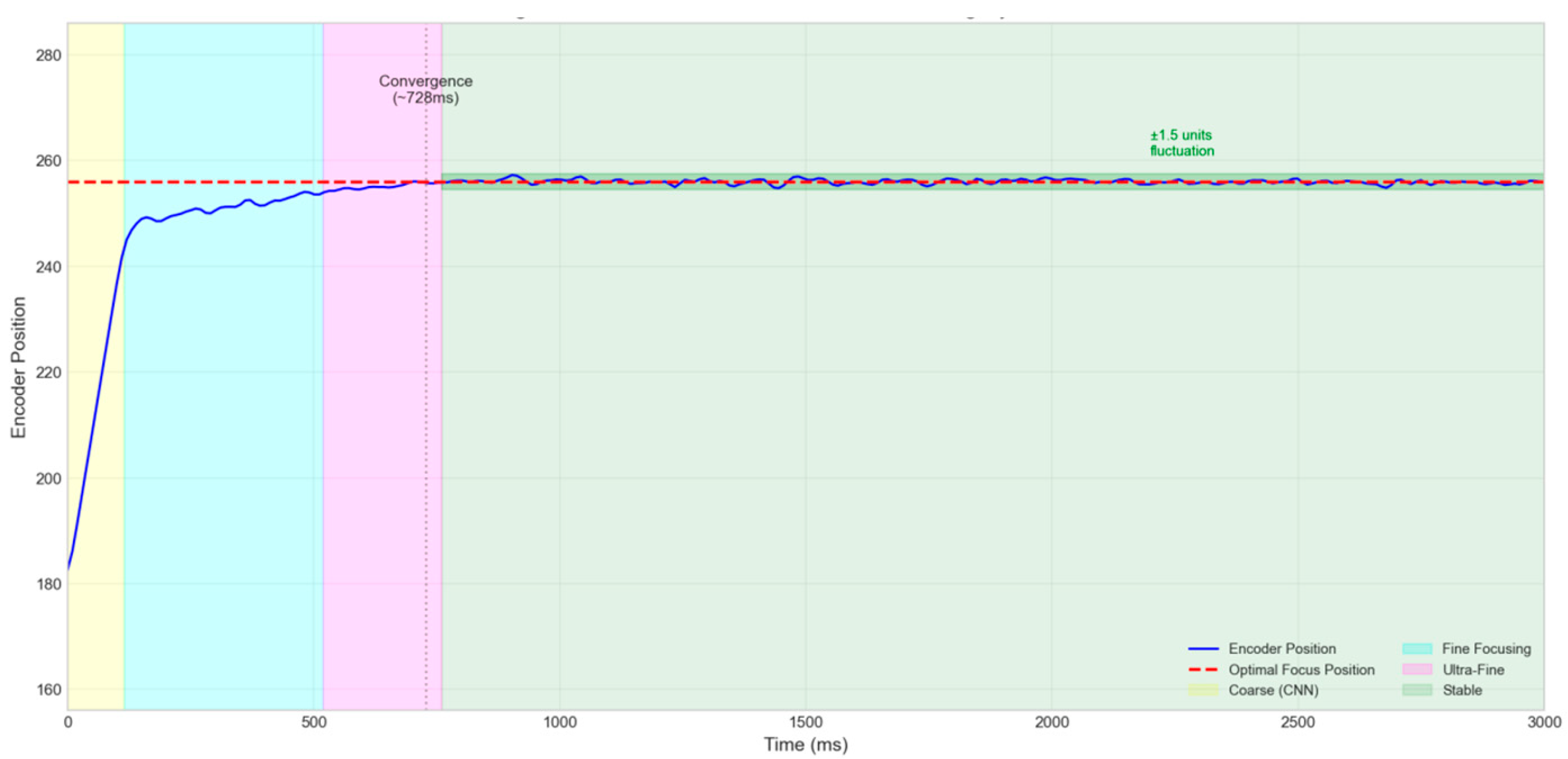 - Encoder Position Timing Curve: Figure 13 shows the timing curve of the lens encoder position during the dynamic test. After initial convergence (approximately 700 ms), the encoder position exhibits minor fluctuations (±1.5 encoder units) around the optimal focus, indicating the system’s good dynamic tracking capability.