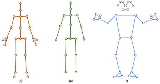 Comparison of body topologies. (a) Kinect v2: defined by 25 keypoints; (b) GSI: employs a selective 17-keypoint structure; (c) MediaPipe: includes 33 landmarks. The GSI topology retains only gait-relevant landmarks while excluding extremities and facial or hand landmarks.