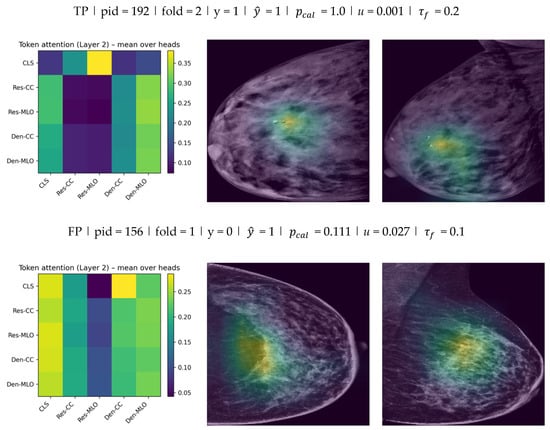 Model C (DVTF without MC-dropout): Model C implemented dual-view transformer fusion at the breast-side level. For each tensor, the CC low-energy image (channel 0) and MLO low-energy image (channel 1) were extracted. Each view was converted to pseudo-RGB and processed using the same ImageNet normalization used across models. Two ImageNet-pretrained backbones were employed in parallel: ResNet-101 and DenseNet-121. From each backbone, a 1024-dimensional L2-normalized embedding was produced for each view using global average pooling followed by a linear projection. This produced four tokens per side: . A learnable [CLS] token and learned positional embeddings were appended to form a sequence of 5 tokens of dimension 1024. The token sequence was then fused using a 2-layer Transformer encoder with 4 attention heads and a feed-forward dimension of , using GELU activations and dropout . The final [CLS] embedding was mapped to logits using a lightweight classifier head 1024 → 256 → 2 with GELU and dropout . Model C is evaluated deterministically using a single forward pass at test time; thus, dropout is not used for Monte Carlo sampling and no calibration model is fitted.