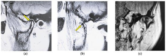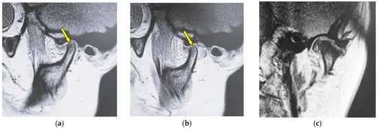 MR image (proton-density-weighted) of an 82-year-old woman (disc displacement without reduction, left disc): (a) sagittal oblique cross-section imaging in the mouth-closing position; (b) sagittal oblique cross-section imaging in the mouth-opening position; (c) coronal oblique cross-section imaging in the mouth-closing position. The arrow shows the part with atrophy.