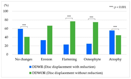 Previous reports showed that DDWOR occurs as osteoarthrosis [23,26], and a nine-times-greater likelihood of osteoarthrosis occurrence was observed in DDWOR compared to the disc displacement with reduction (DDWR) [28]. Osteoarthrosis shows erosion, flattening, osteophytes, irregularities, or deformities on the surface of the mandibular condyle, as well as subchondral bone sclerosis [38]. However, few reports show the relation between the type of bone changes and the symptoms [39]. This study aimed to examine the type of bone changes in disc displacement and mentions the factors relating to bone changes.