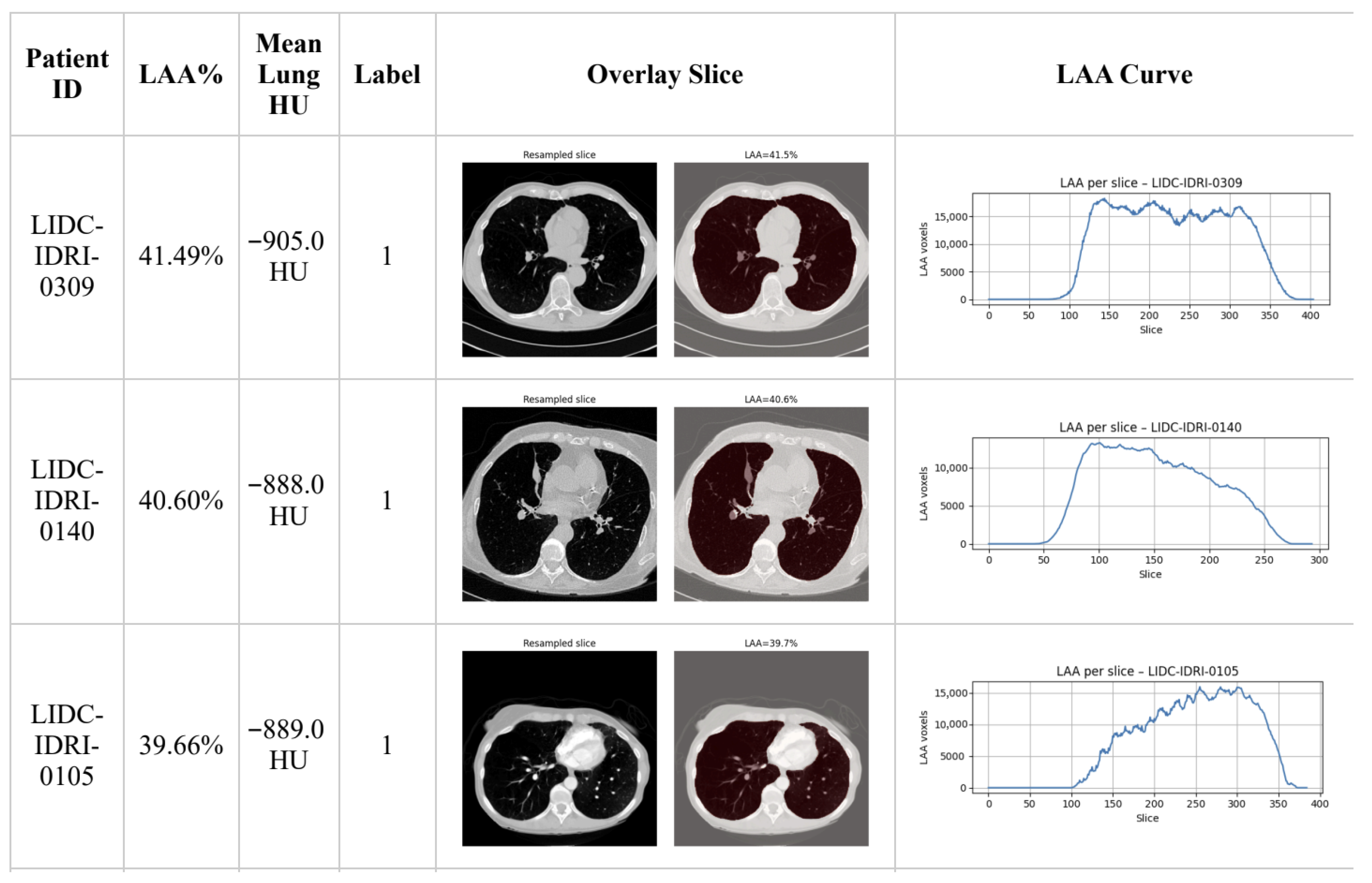 | Patient ID | LAA% | Mean Lung HU | Label |