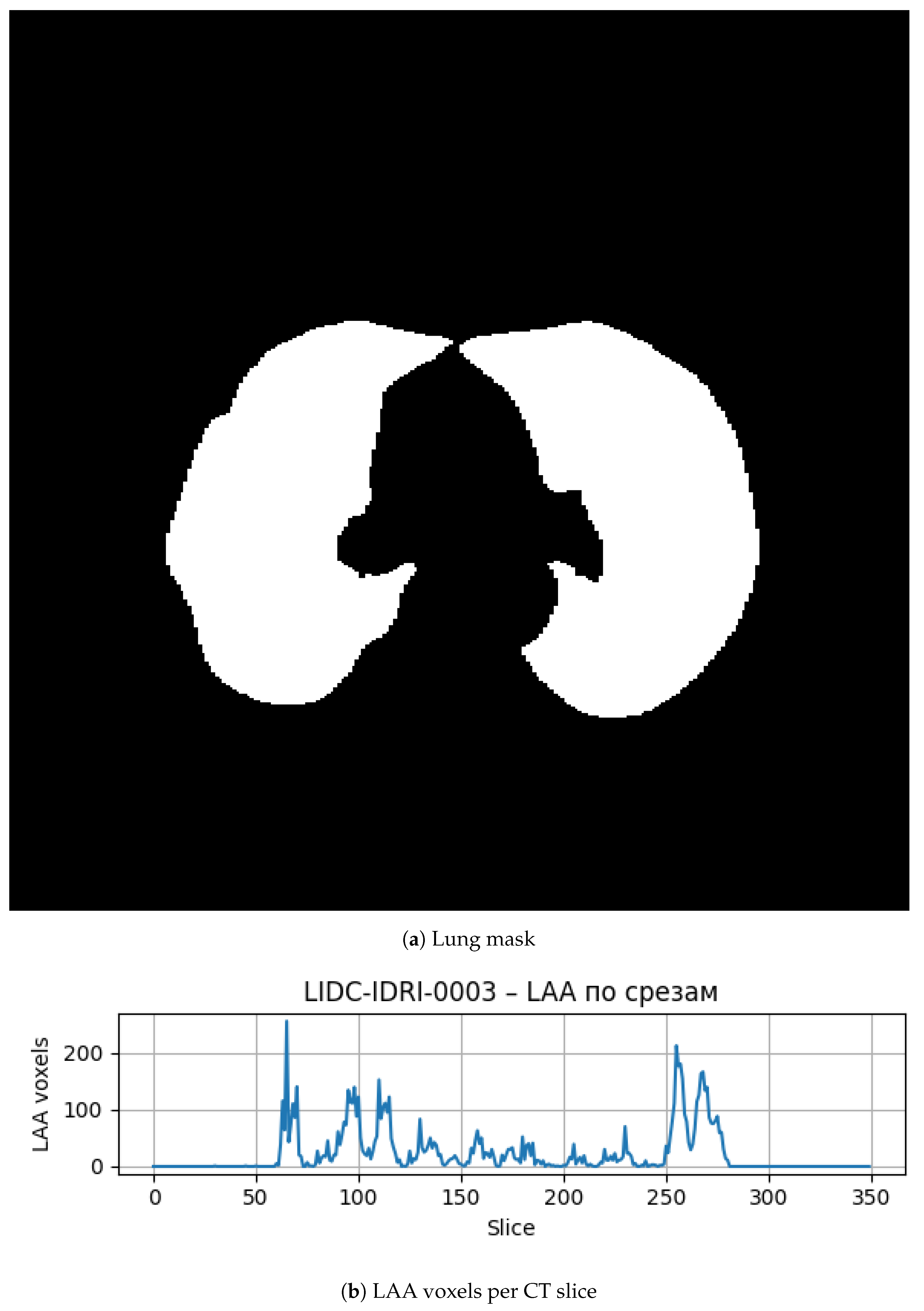 LAA% was calculated as the proportion of such voxels within the segmented lung mask.