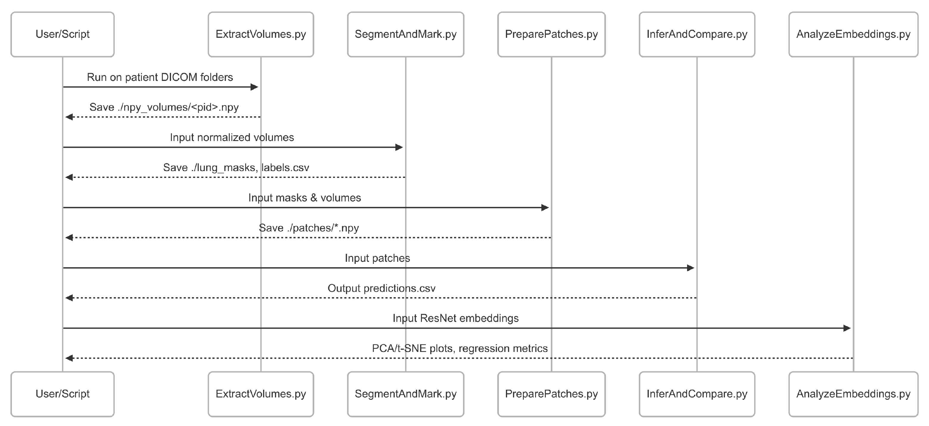 Sequence diagram illustrating the interaction between core scripts in the pipeline for interpretable emphysema diagnosis. The diagram depicts the flow of data between modules: ExtractVolumes.py, SegmentAndMark.py, PreparePatches.py, InferAndCompare.py, and AnalyzeEmbeddings.py, along with intermediate outputs (e.g., masks, predictions, embeddings).