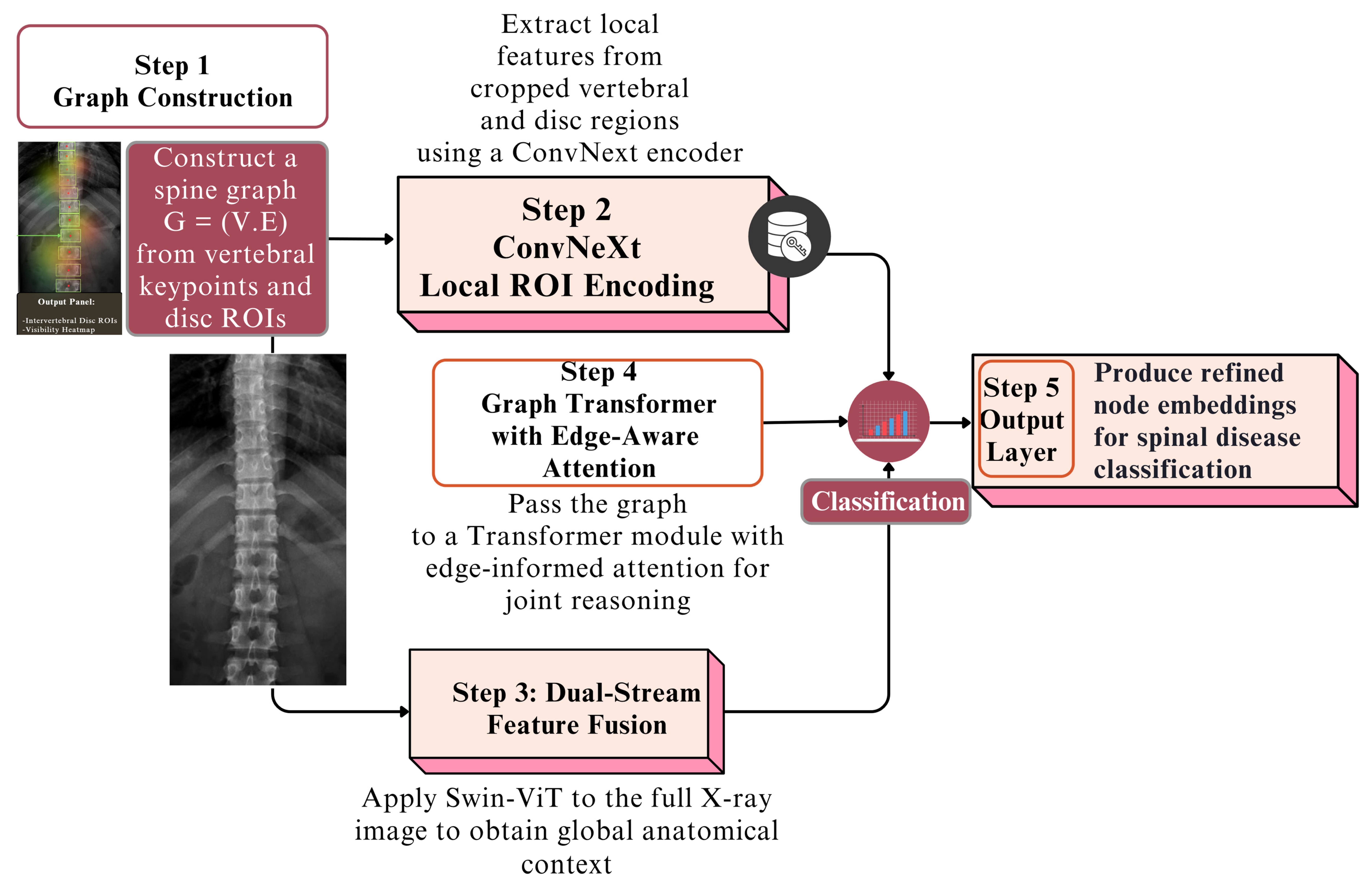 Graph Neural Networks (GNNs) address fundamental limitations of convolution-based architectures by modeling anatomical structures as interconnected networks, where vertebrae and intervertebral discs represent nodes and their biomechanical relationships constitute edges. This paradigm enables unified learning of local pathologies and global spinal alignment patterns.