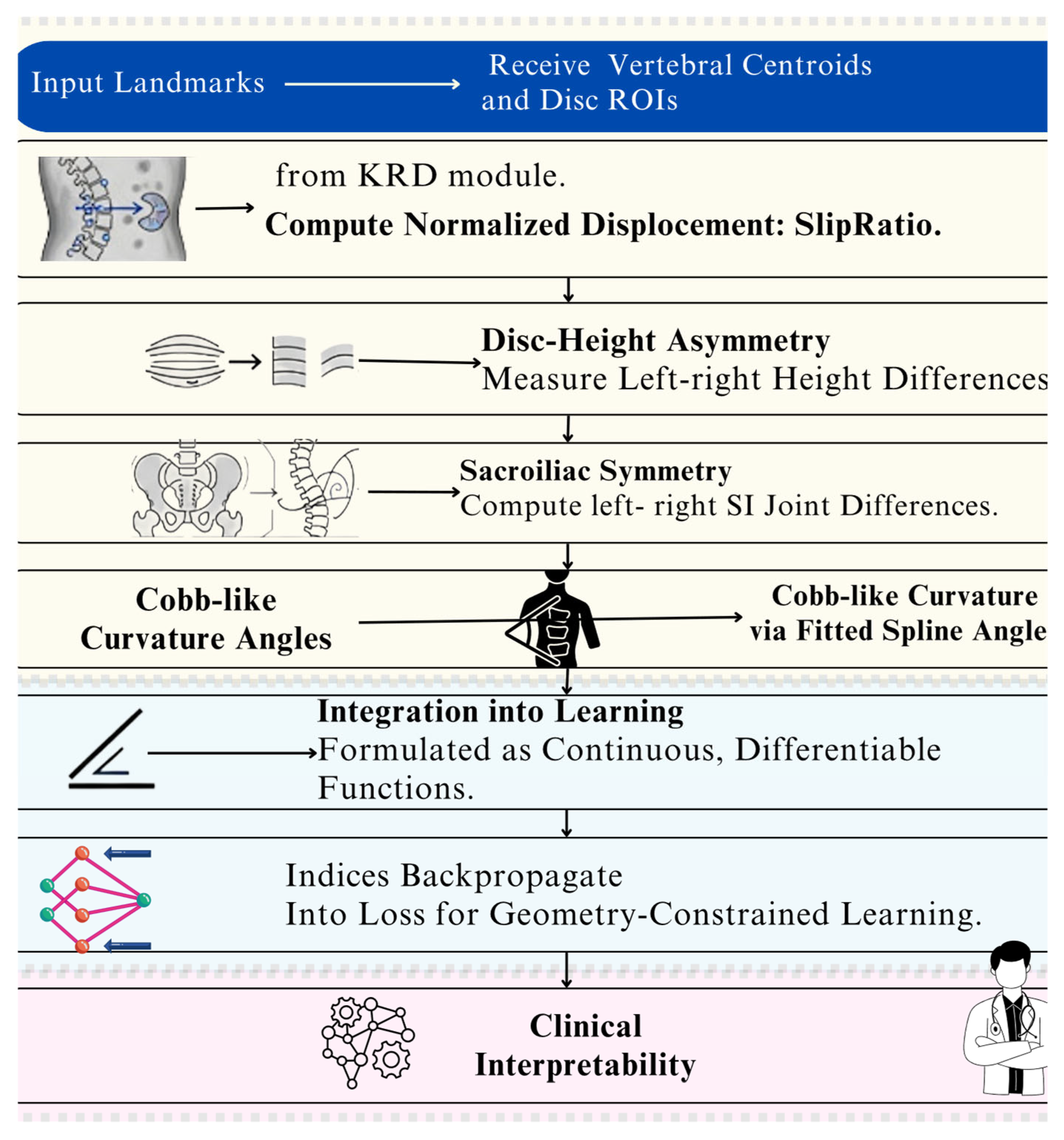 3] developed a multimodal network for spine MRI segmentation. Despite these advances, key limitations persist. Predominantly, existing models lack clinical interpretability, operate as opaque black boxes, and fail to provide radiographic indices familiar to clinicians. Additionally, many models do not incorporate anatomical constraints, which can result in plausible-looking but clinically inconsistent outputs, as shown in studies by Yang et al. [