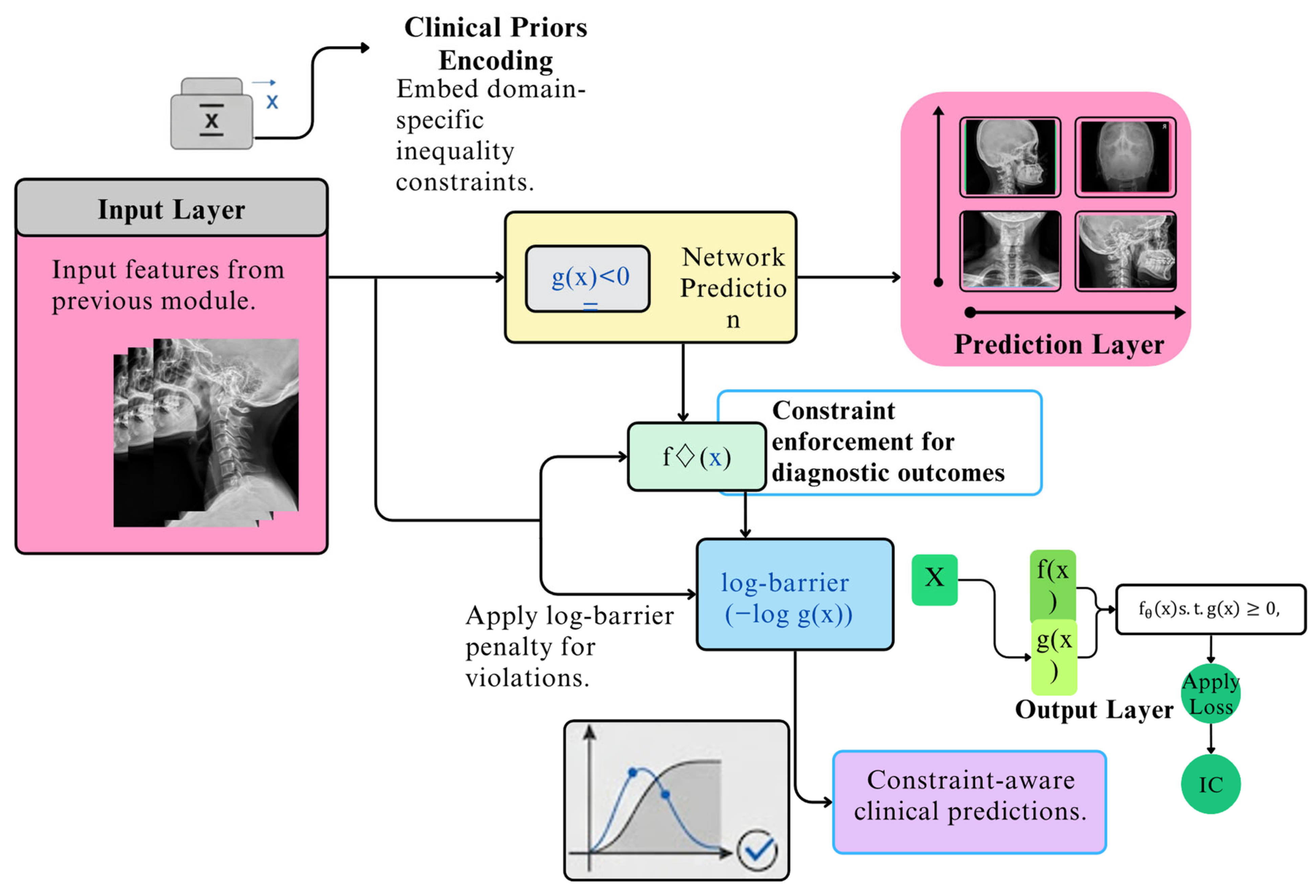 69]. Second, the neuro-symbolic constraint layer (NSCL) ensures AI predictions maintain consistency with fundamental radiological principles, preventing the clinically implausible outputs that often undermine radiologist trust in AI systems [