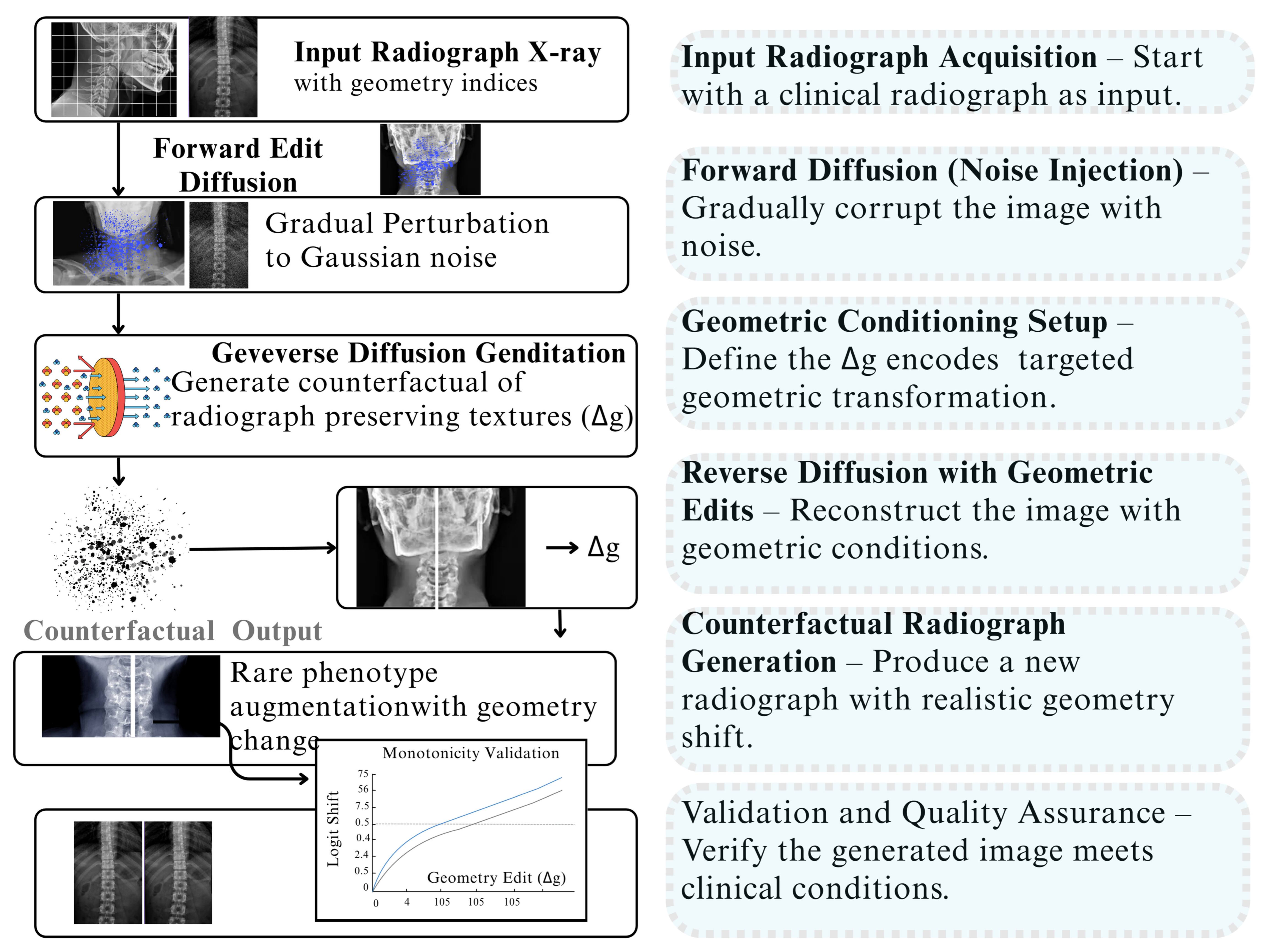 The Counterfactual Geometry Diffusion (CGD) module generated radiographs with targeted geometric alterations while preserving anatomical texture and radiographic fidelity. Generated counterfactuals elicited monotonic, clinically coherent classifier logit shifts, with disease probabilities increasing proportional to geometric abnormality severity, demonstrating diagnostic rather than merely visual validity.