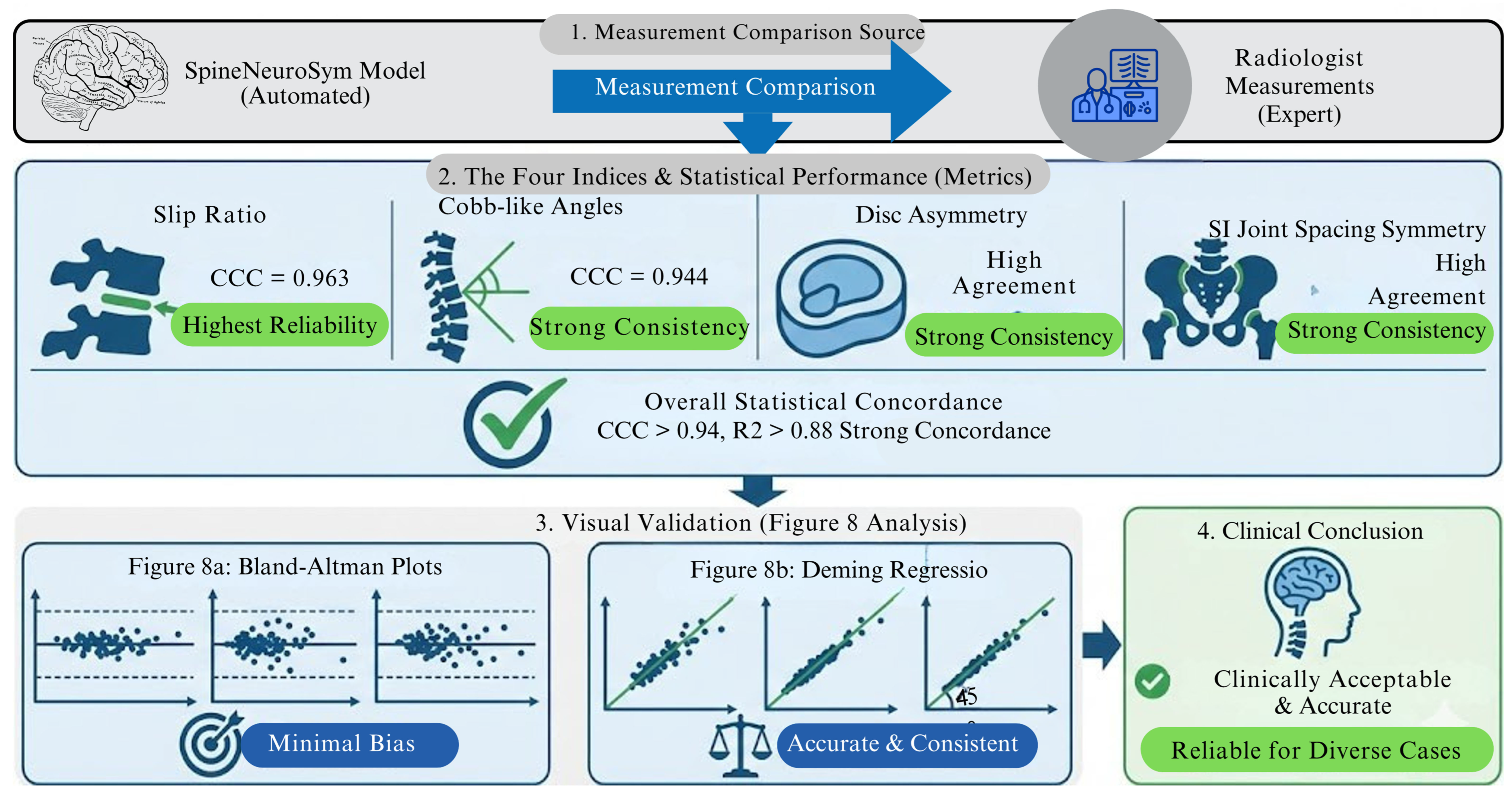 21], neither paradigm inherently produces verifiable radiographic measurements. SpineNeuroSym addresses this gap by elevating radiographic indices to trainable outputs, aligning deep learning predictions with clinical workflows.