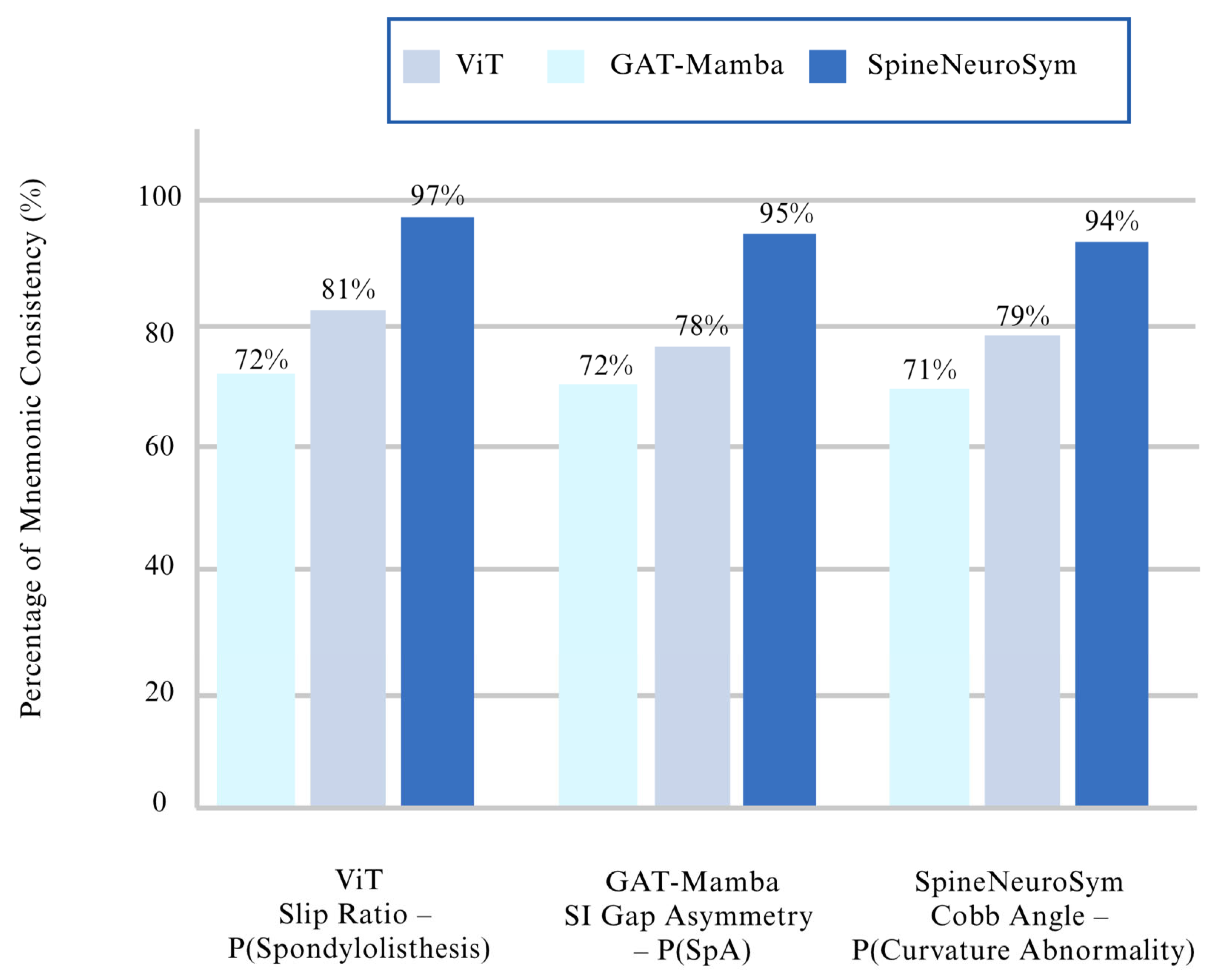 SpineNeuroSym achieved superior directional consistency: 97% alignment between slip ratio and spondylolisthesis probability, 95% between sacroiliac joint asymmetry and spondyloarthropathy likelihood, and 94% between Cobb angle and curvature abnormality classification, compared to baseline maximum consistency of 81%.