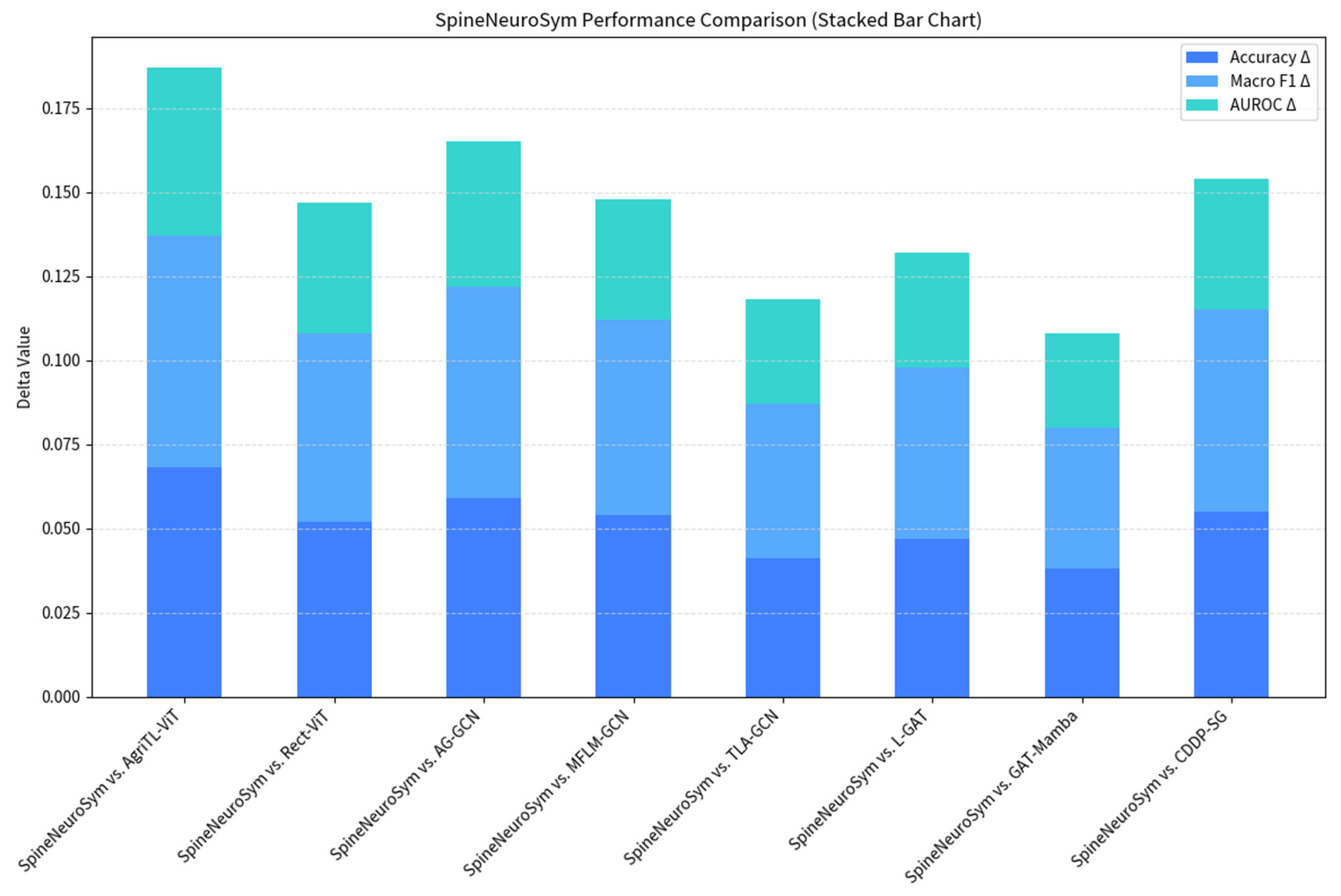 SpineNeuroSym achieved 89.4% accuracy, 0.872 macro-F1 score, and 0.941 AUROC, outperforming all baselines including GAT-Mamba (85.6% accuracy, 0.913 AUROC). The 4% accuracy improvement represents clinically significant gains for patient care. This translates to dozens of additional correct diagnoses per hundred patients, directly impacting patient management and reducing diagnostic errors.