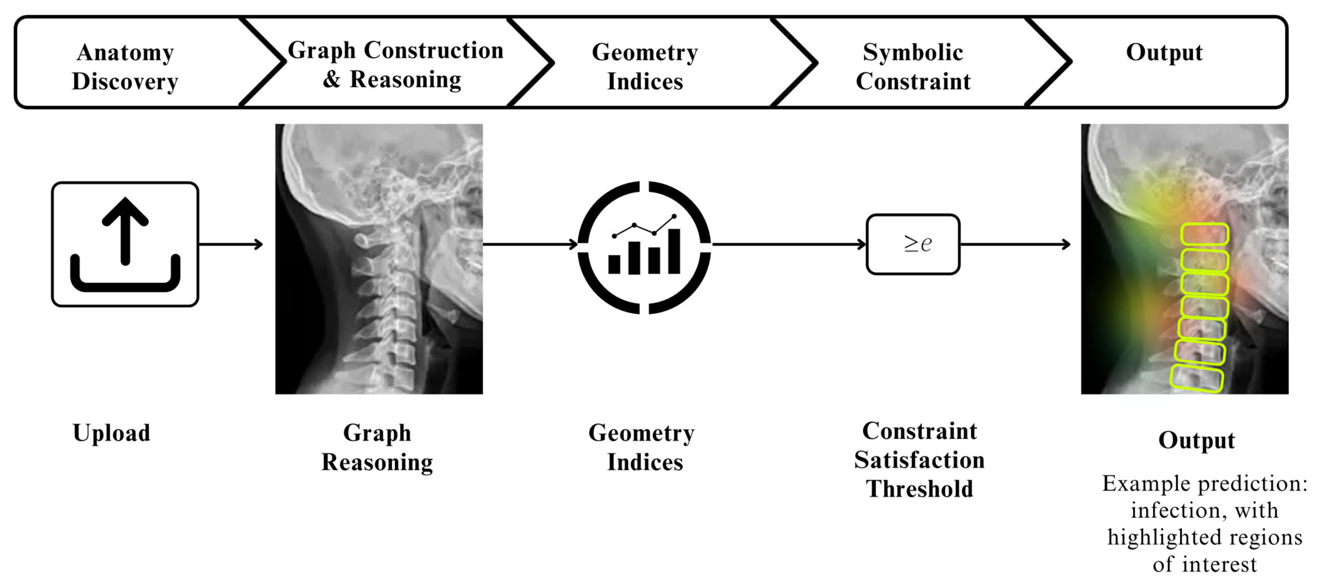 Theoretically, the framework demonstrates that radiographic knowledge becomes computationally tractable through differentiable indices and optimizable clinical constraints, bridging representation learning and domain logic divides. Methodologically, results confirm that accuracy and trustworthiness are not mutually exclusive: co-designed geometric, symbolic, and generative mechanisms enable models to outperform statistical competitors while producing radiologically verifiable outputs.