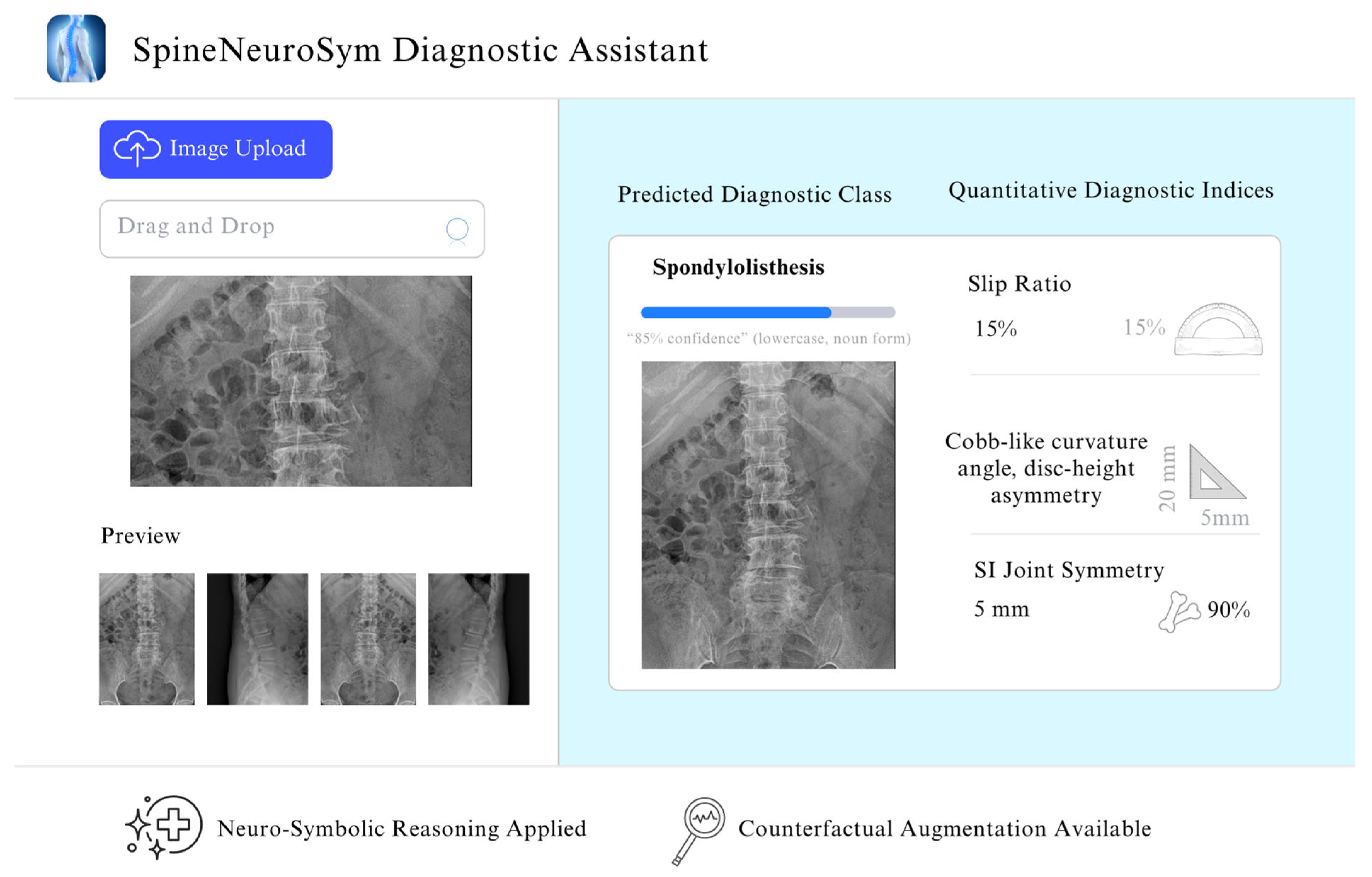 Enhancement derives from SpineNeuroSym’s dual role as diagnostic support system and cognitive scaffold, situating predictions within trusted radiographic logic such as monotonic slip ratio-spondylolisthesis relationships. Counterfactual modules enable clinician observation of prediction evolution under simulated geometric perturbations, providing AI reasoning “stress testing” rarely available in conventional systems. This extends structured explanation approaches [