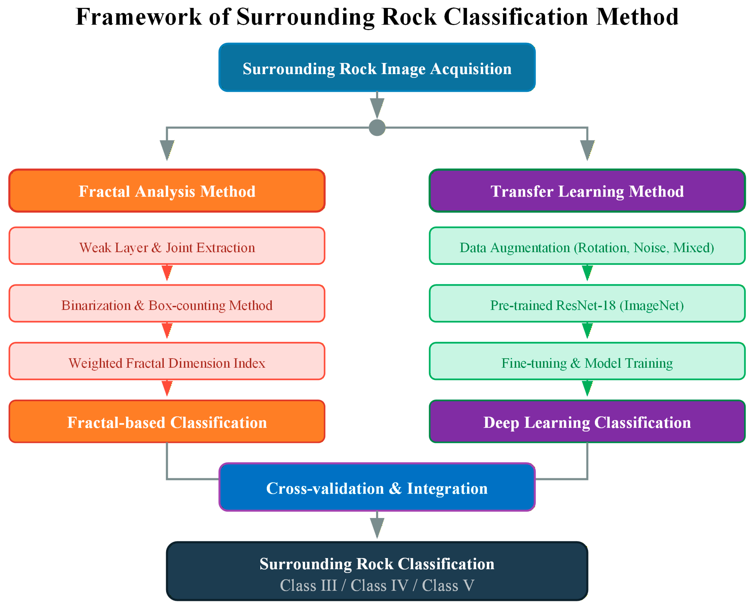 Figure 1. The framework consists of two parallel analysis approaches that complement each other. The fractal analysis branch extracts weak layers and joints from rock images, calculates fractal dimensions using the box-counting method, and generates a weighted fractal dimension evaluation index for classification. The transfer learning branch employs data augmentation and a pre-trained ResNet-18 model to achieve automated image-based classification. The two approaches provide cross-validation for the surrounding rock classification results, enhancing the reliability and robustness of the final evaluation. When discrepancies occur between the two methods, the more conservative (lower) rock class is adopted to ensure construction safety.