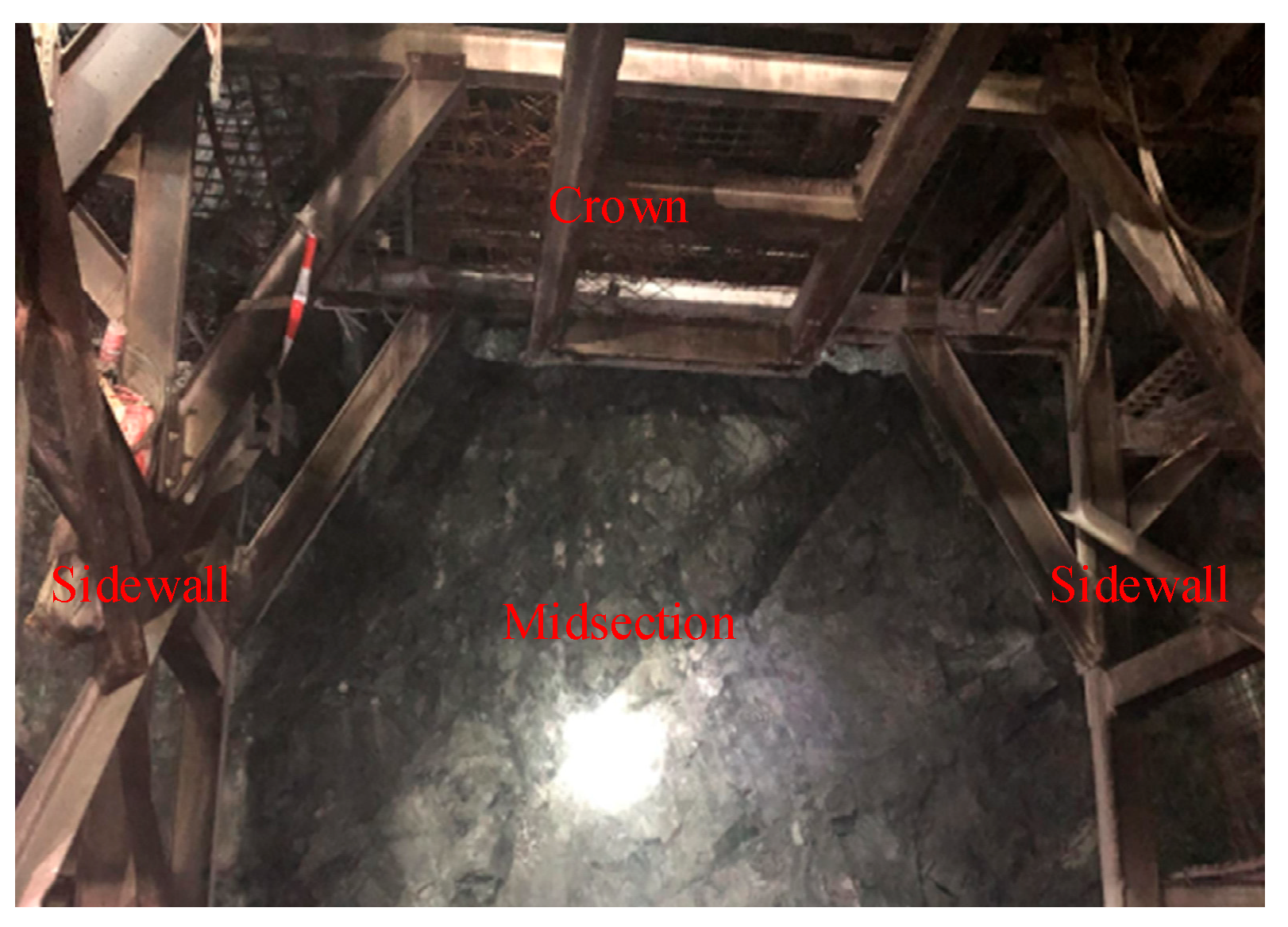 31]. Additionally, a consensus-based approach was adopted where experienced engineers discussed and agreed upon the final classification for ambiguous cases. Approximately 1700 faces were finally selected for data acquisition. Standardized images were collected from these faces following a consistent acquisition protocol. The imaging equipment consisted of smartphone cameras (resolution ≥ 12 megapixels) to ensure accessibility and practicality in field conditions. The shooting distance was maintained at 1.5–2.0 m from the rock surface to capture sufficient detail while covering an adequate area. Illumination was provided by the tunnel’s permanent LED lighting system to ensure consistent lighting conditions across all images. The camera was positioned perpendicular to the rock surface to minimize perspective distortion. Collection areas covered the midsection, crown, and sidewall of each excavation face, as illustrated in