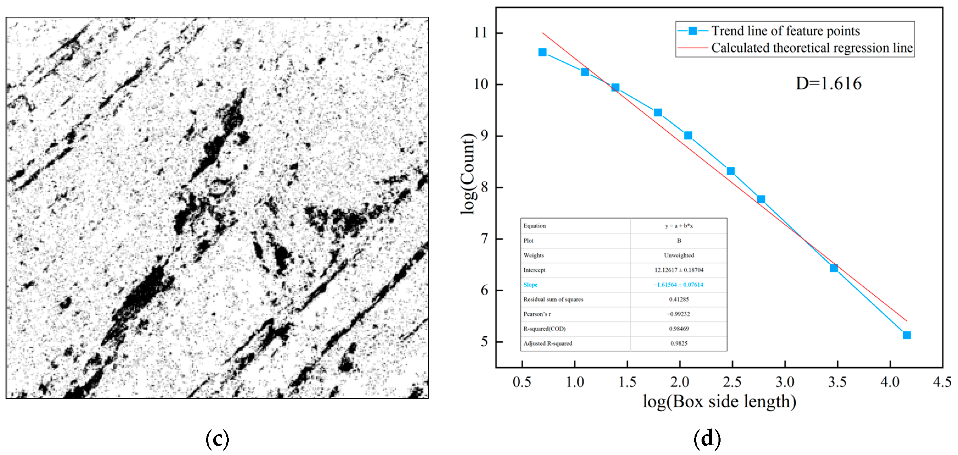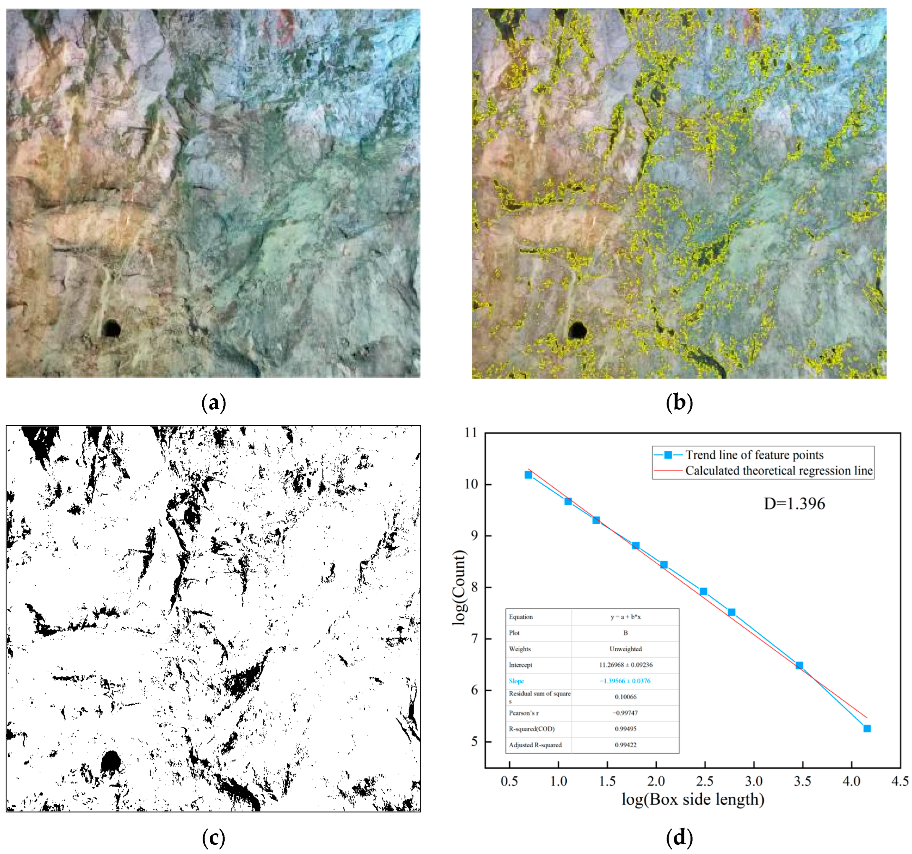 Figure 3b,c. Within the weak layer regions in the images, the box dimension method based on fractal theory is used to investigate their complexity and structural properties. The fractal analysis results for class V surrounding rock are shown in
