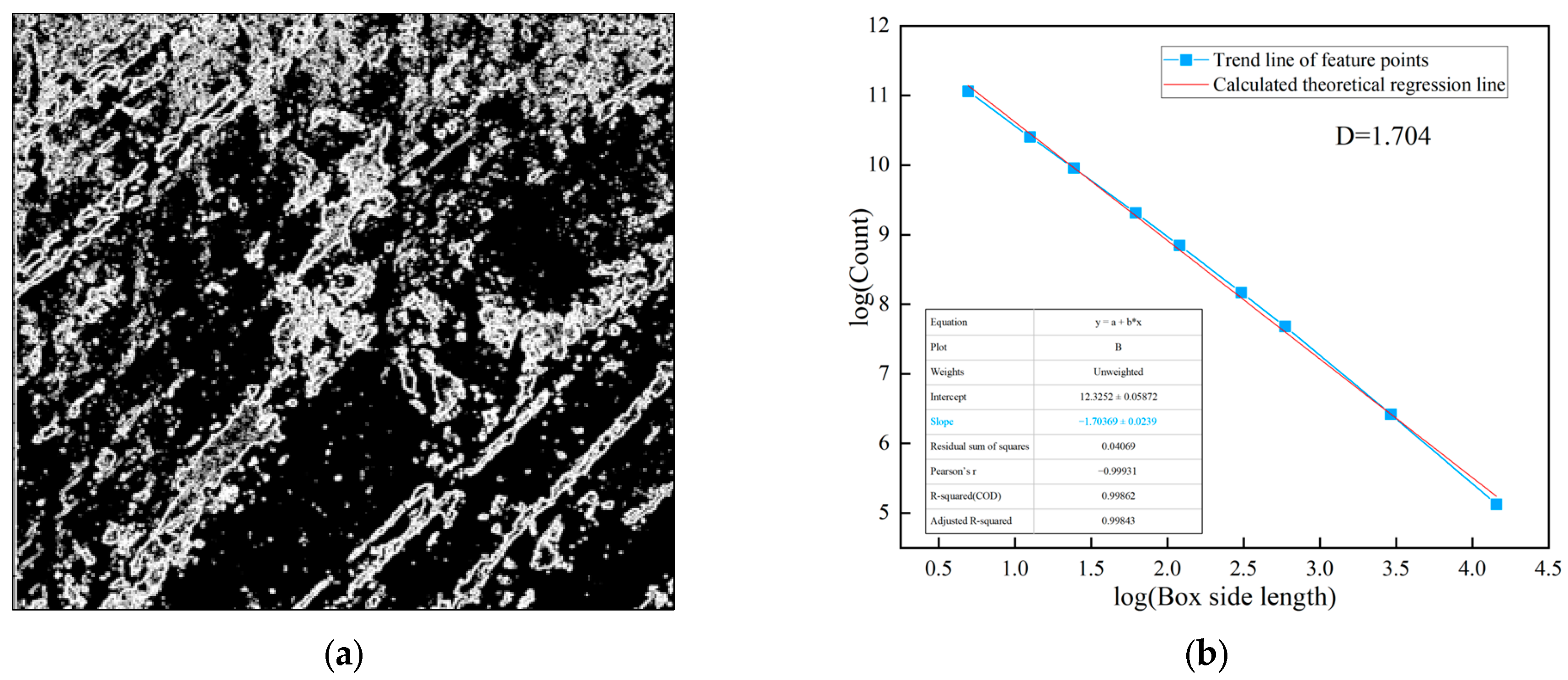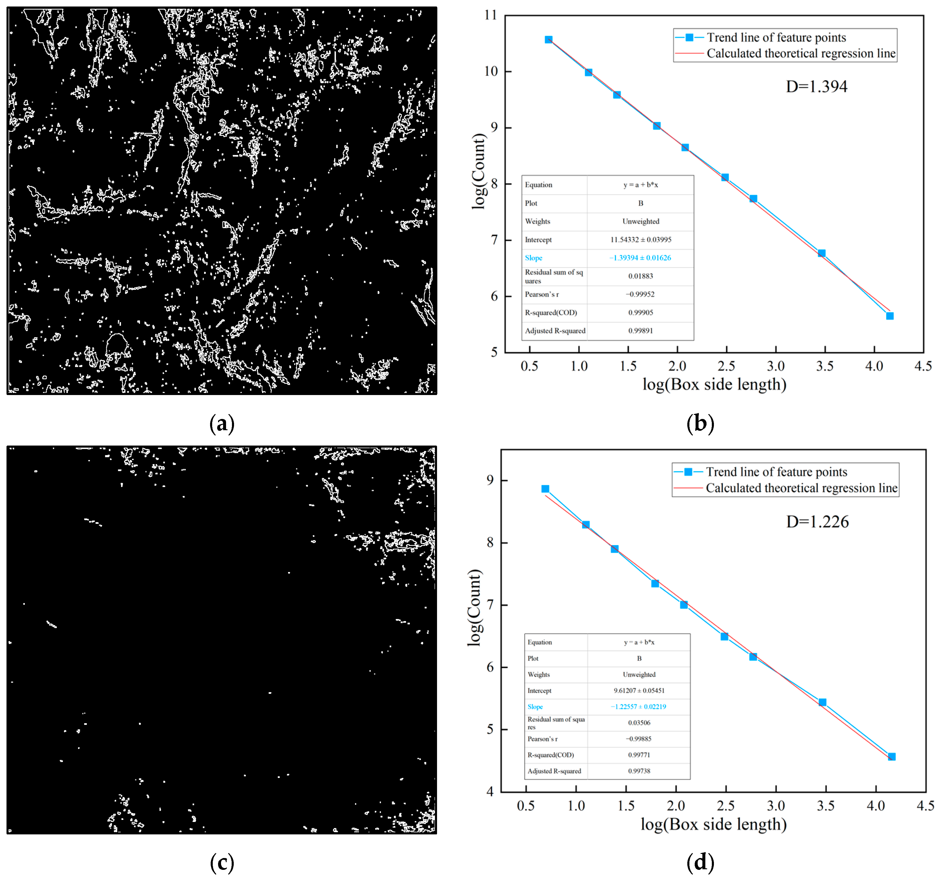 Figure 5b, and subsequent fractal analysis figures. A higher slope indicates greater structural complexity and irregularity of the analyzed features. The coefficient of determination (