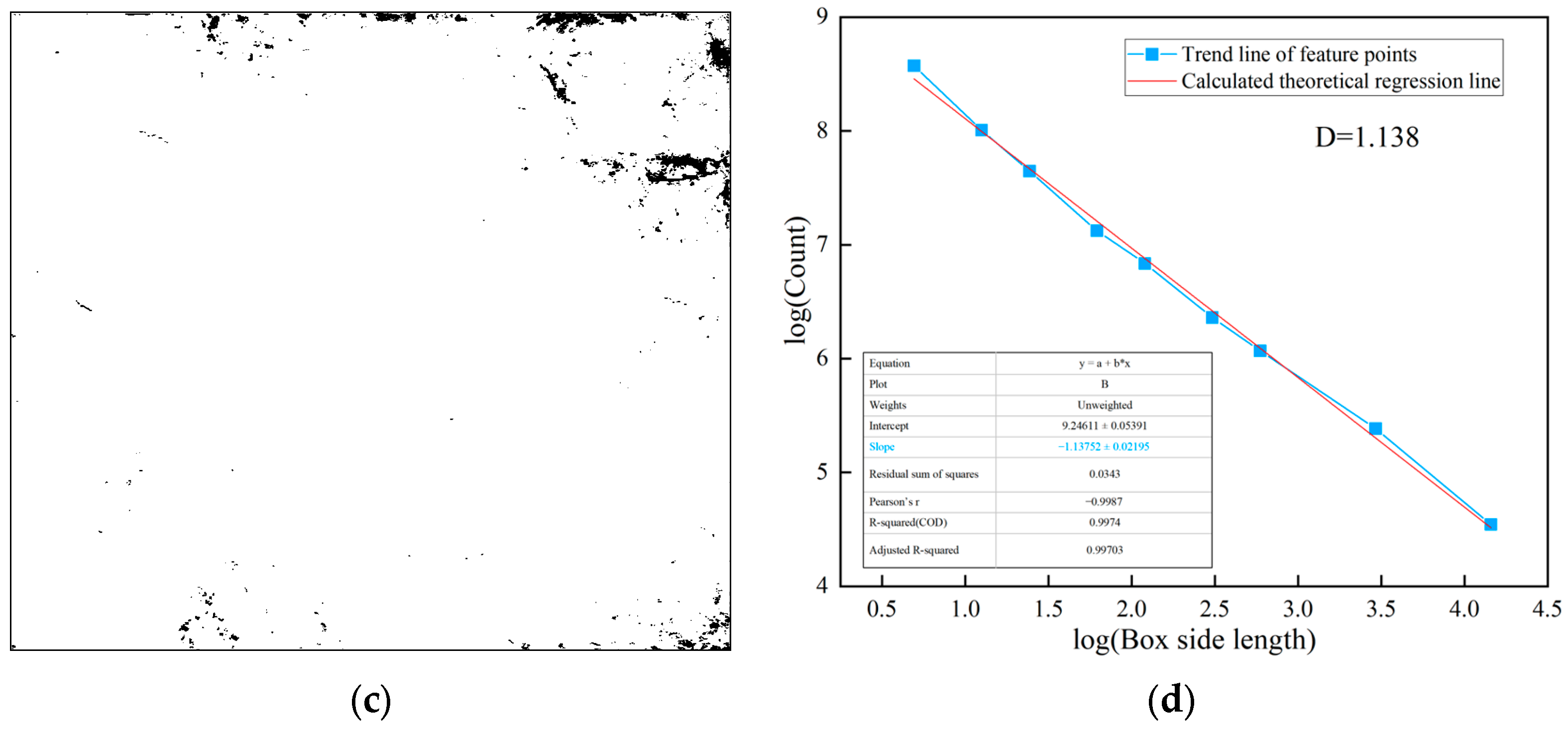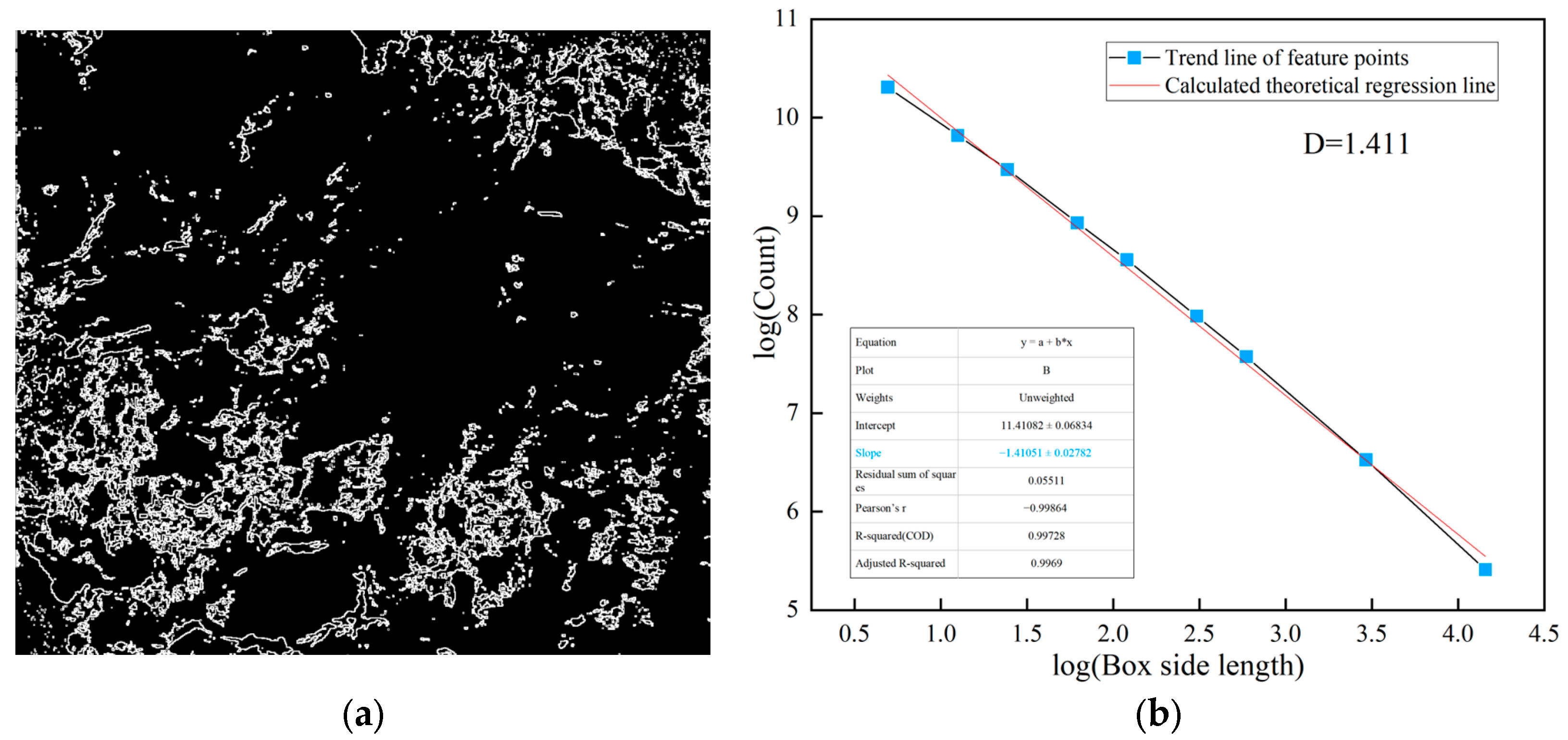 y-axis, a linear relationship is obtained. The slope of the fitted regression line represents the fractal dimension
