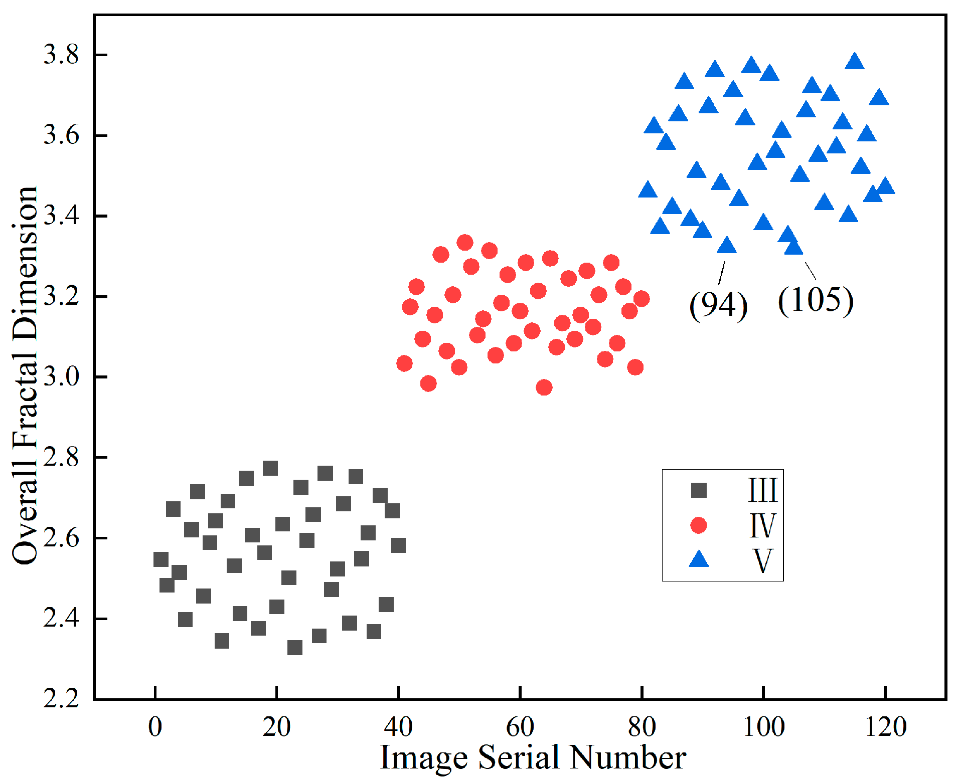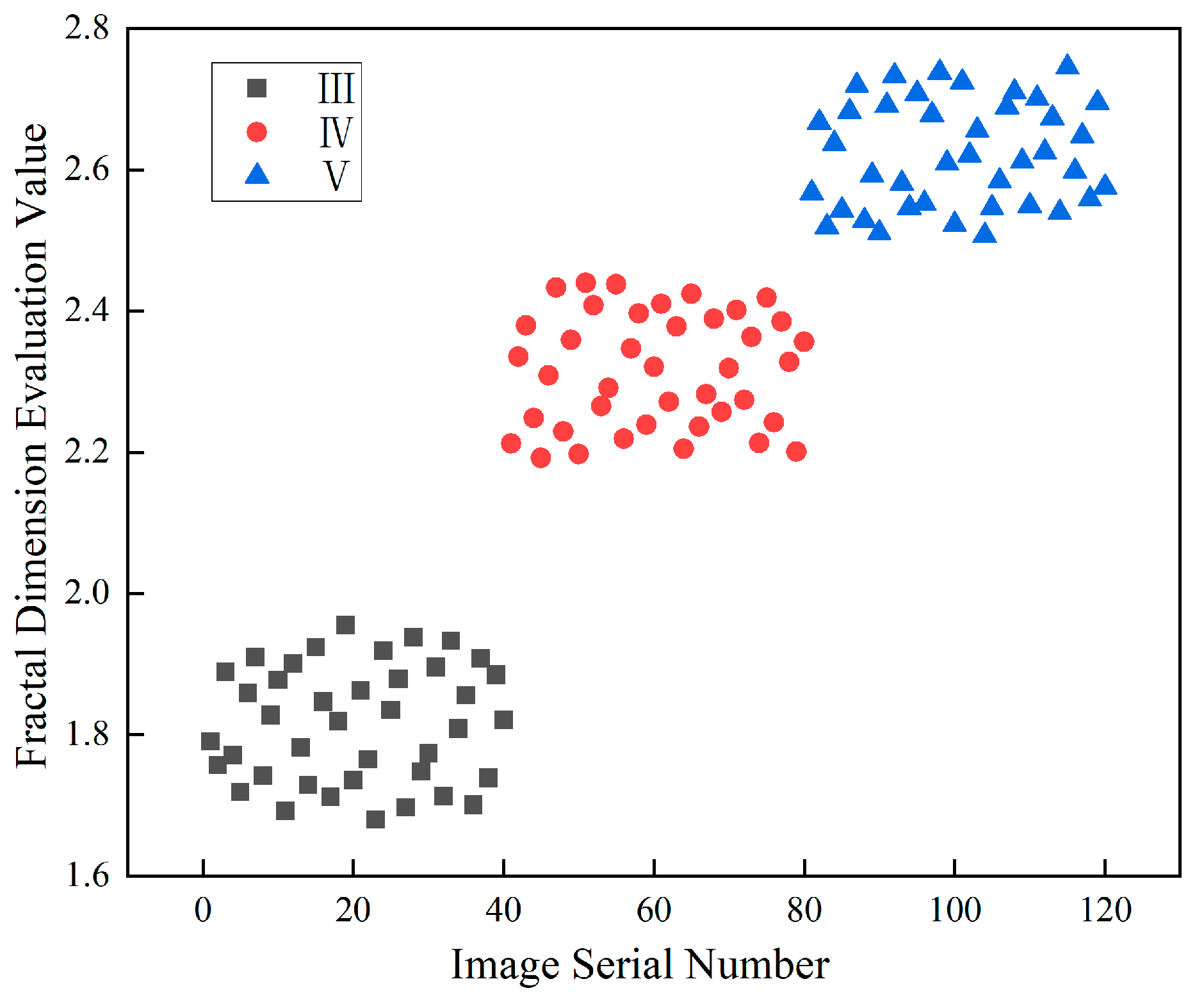 As shown in the figure, distinct differences are observed in the overall fractal dimension distribution ranges of classes III, IV, and V surrounding rock. The overall fractal dimension range of class III surrounding rock mainly falls within the interval of 2.321 to 2.786, while that of class IV ranges mainly from 2.974 to 3.344, and that of class V ranges from 3.322 to 3.884. The overall change in trend is that the worse the surrounding rock, the higher the overall fractal dimension. Meanwhile, a clear boundary exists in the distribution range of the overall fractal dimensions of classes III and IV, that is, the maximum value of class III is 2.786 and that of class IV is 2.974. Both classes IV and V also have differences in the distribution range, but there are some values with smaller fractal dimensions in class V that are less than the maximum value of class IV surrounding rock, and the range boundary is not clear.