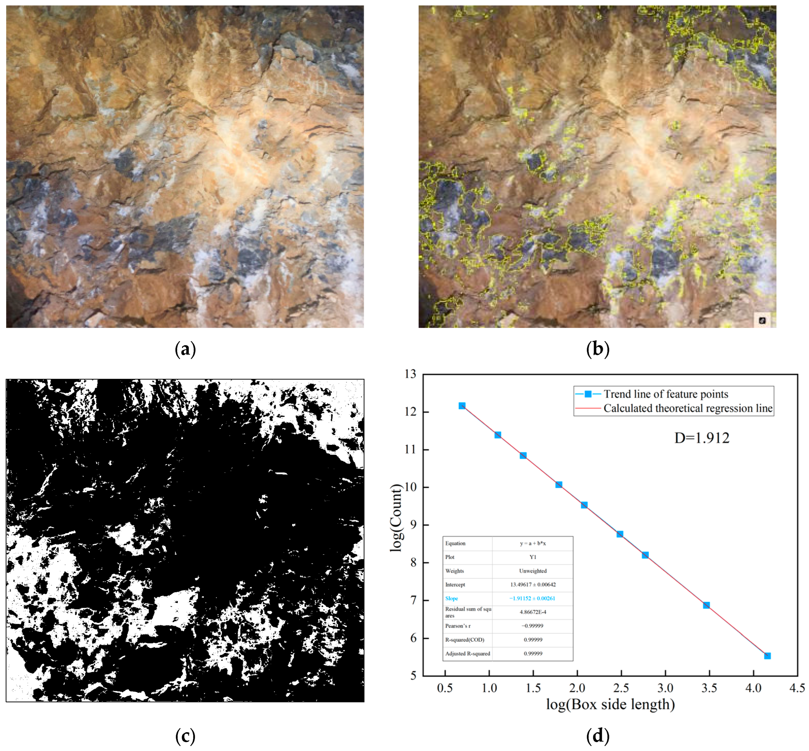 The image processing analysis of class V surrounding rock. (a) Class V surrounding rock; (b) weak surface extraction; (c) binarization processing; (d) fractal dimension analysis.