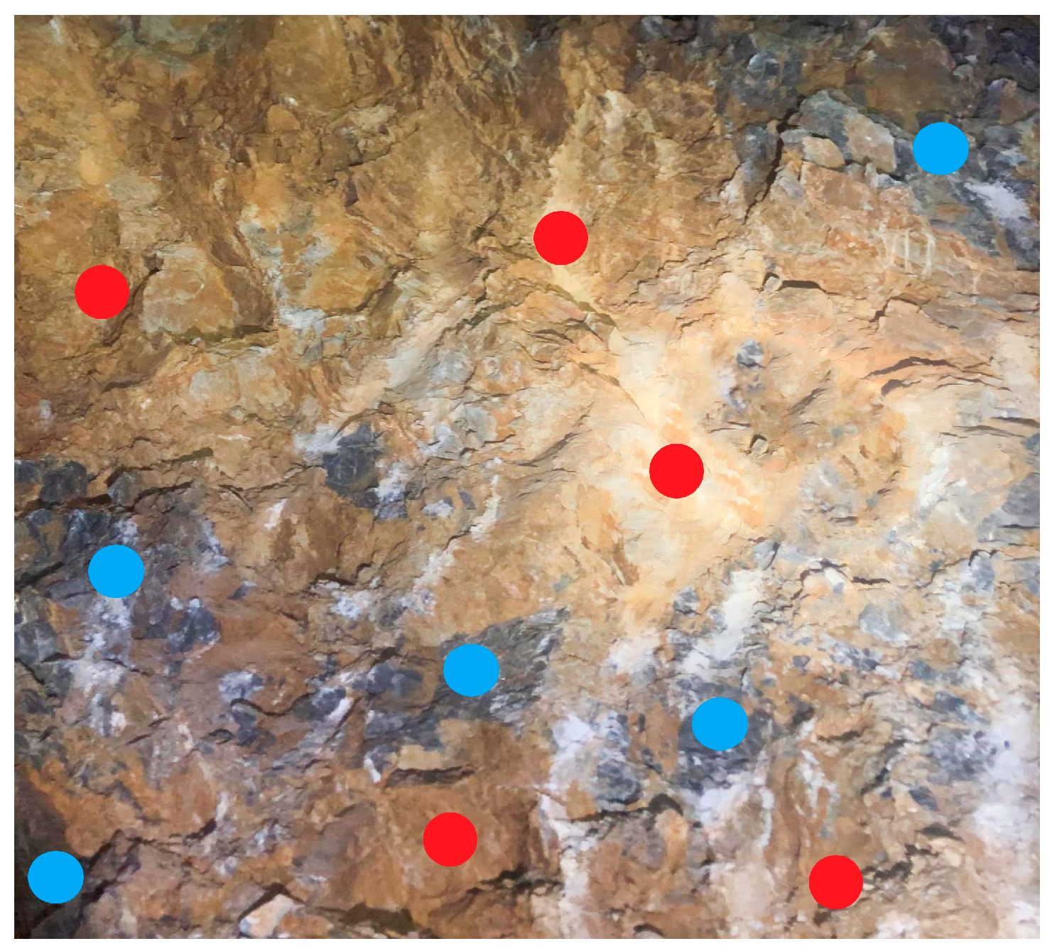 Figure 17. In the figure, red points represent measurement points within the weak layers, while blue points denote those in the hard rock. After extraction, the strength values obtained from the weak layer and hard rock areas are averaged separately. The corrected strength of the surrounding rock is then calculated as the weighted sum of the average strength values of the weak and hard rock areas, weighted by their respective area proportions. The correction formula is as follows:
