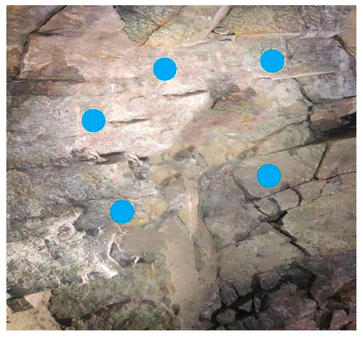 Figure 18, the rebound hammer cannot obtain reliable strength measurements from these zones. Nevertheless, the area proportions of the weak zones (including cavities) and the hard rock regions can still be quantified. Under such surrounding rock conditions, the corrected strength is calculated as the product of the average strength value of the hard rock zone and its corresponding area proportion, using the following formula: