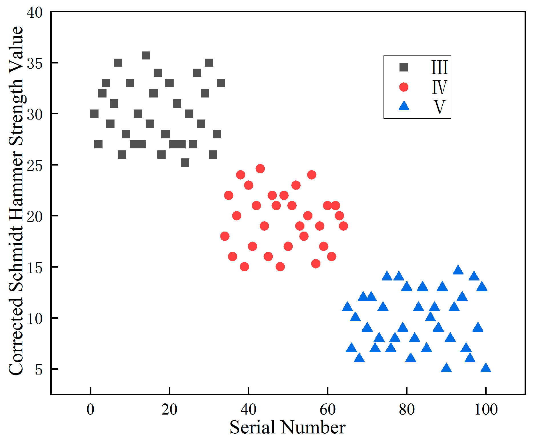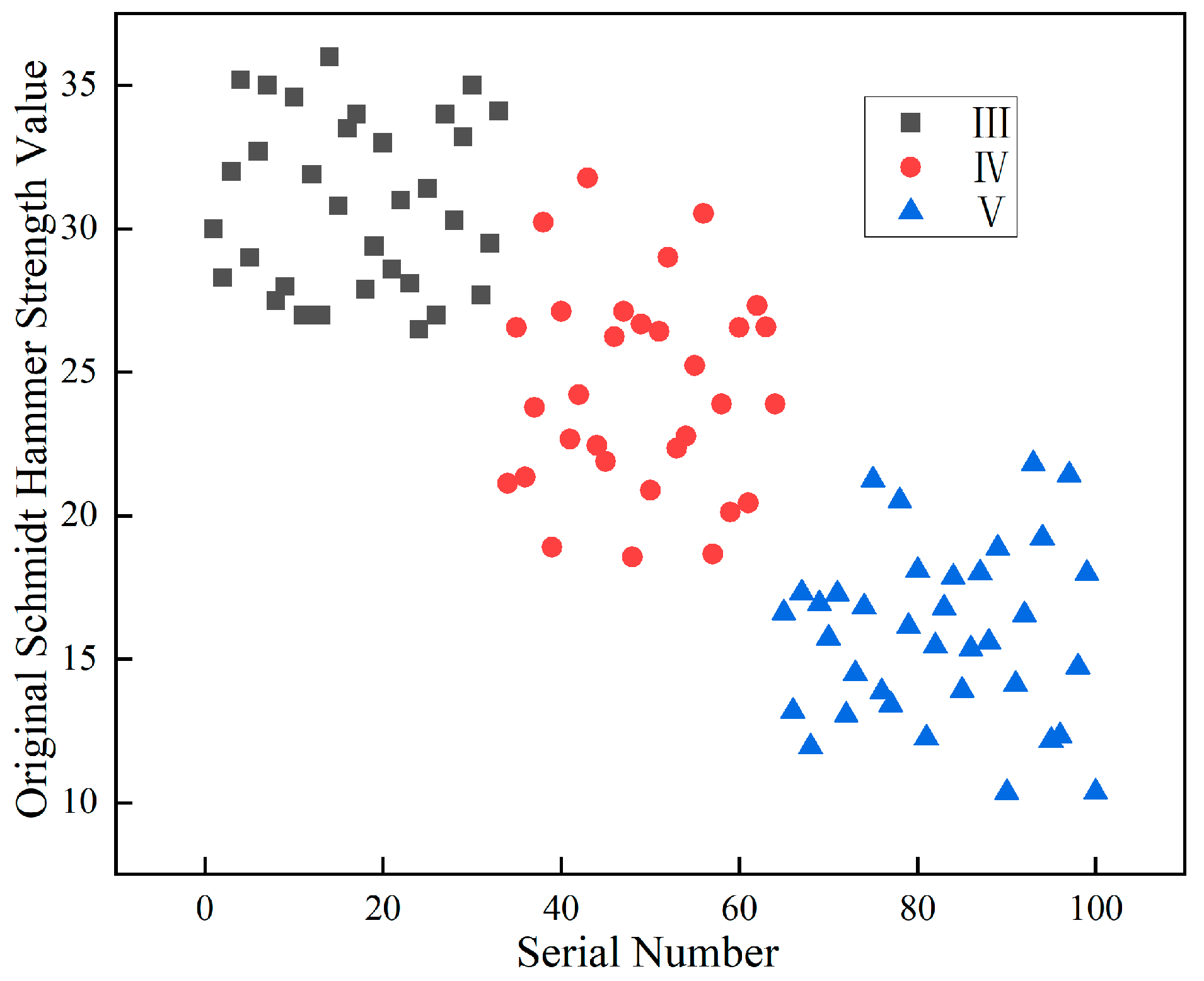 Figure 19. The measured strength ranges are 26.4–36.1 for class III, 18.5–31.7 for class IV, and 10.3–21.8 for class V. Although the data generally exhibit a decreasing trend from class III to class V, significant overlapping intervals are observed between adjacent surrounding rock classes. This substantial overlap indicates that the uncorrected rebound hammer strength values alone cannot serve as a reliable basis for clear classification.