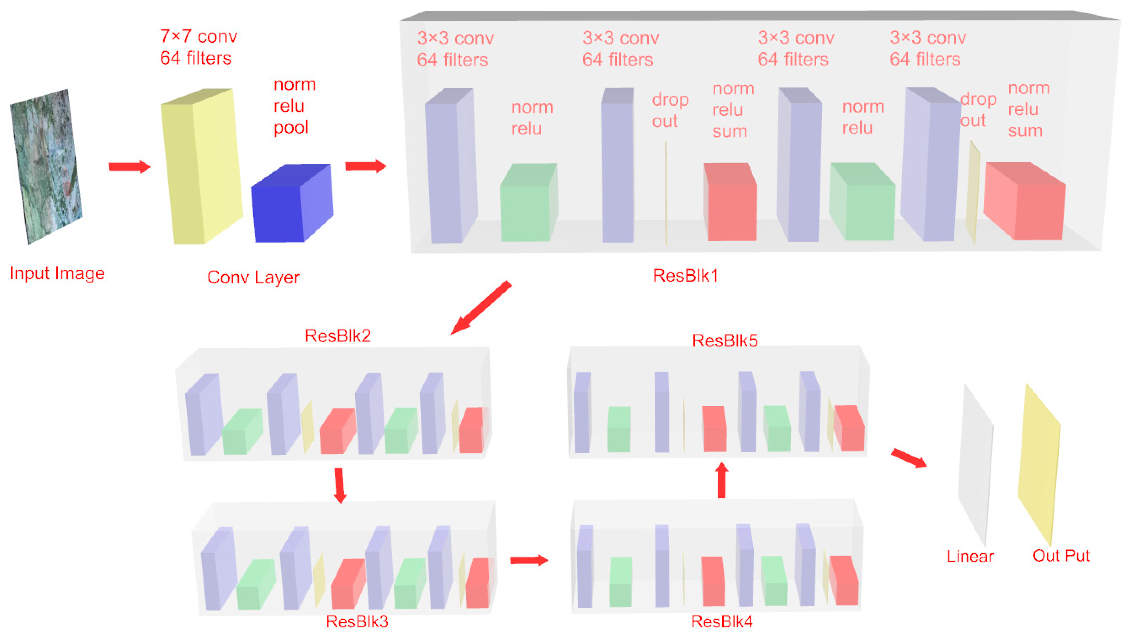 Figure 22. The 7 × 7 convolution layer and the initial convolution layer with 64 filters are used to conduct preliminary feature analysis and extraction on the collected rock surrounding images. The model incorporates the residual block (ResBlock) structure, with each residual block having a double 3 × 3 convolution and a residual connection. The convolution layer is followed by normalization and ReLU activation functions to enhance the nonlinear expression. The residual connection alleviates the gradient disappearance problem in the training of deep networks through identity mapping, improving the model performance. After being processed by multiple residual blocks in series, the features finally reach the linear output layer to generate the final prediction result.