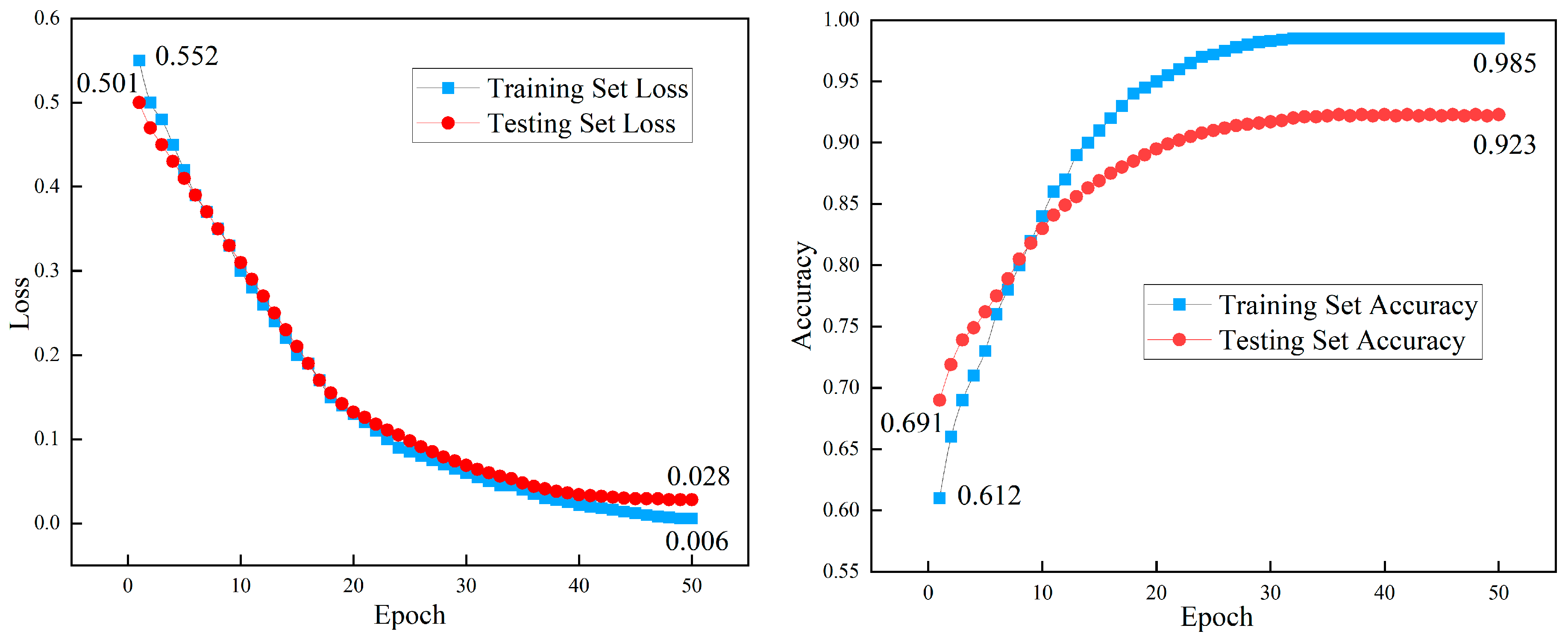 Based on the constructed dataset and model, the corresponding changes in accuracy and loss of the training set and testing set with training epochs are shown in