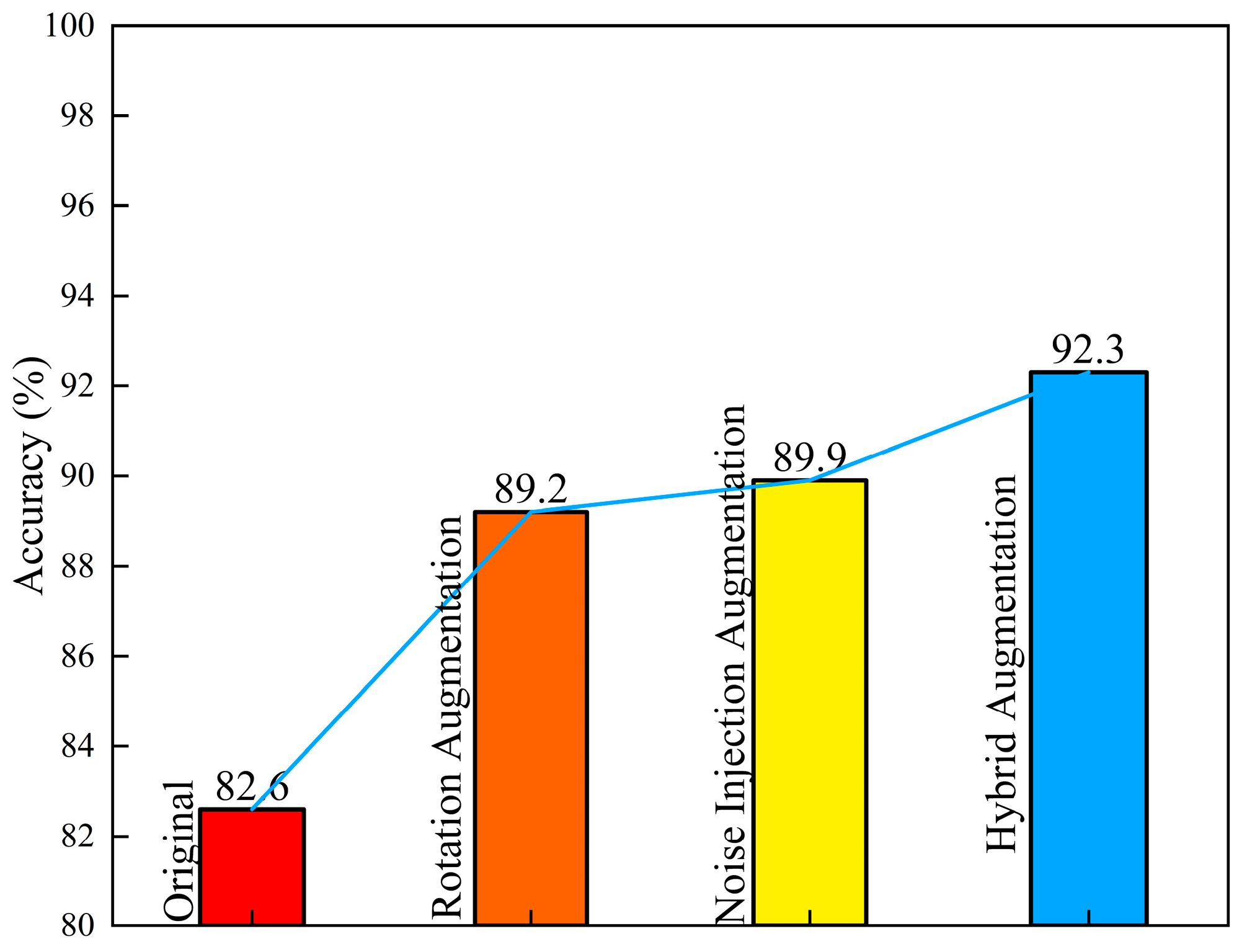Figure 25. The accuracy of the original dataset was 82.6%. After rotation enhancement, it increased to 89.2%, and with noise enhancement, it further reached 89.9%. However, the mixed enhancement method significantly improved the accuracy to 92.3%. This indicates that for rock image samples, mixed enhancement can better enrich the data samples and improve the training accuracy of the model.