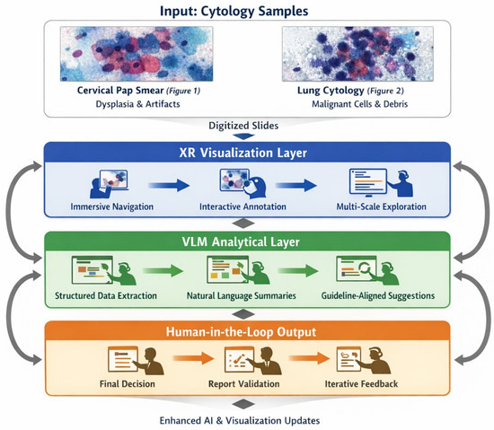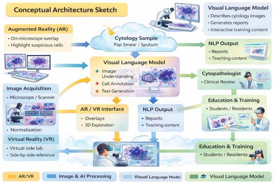 Building on the combined trajectories of digitization and artificial intelligence, a further layer of innovation is emerging through the integration of immersive technologies and Vision–Language Models (VLMs), including large language models (LLMs) [32,33]. Immersive technologies—such as augmented reality (AR), virtual reality (VR), extended reality (XR), and metaverse-based platforms—function as advanced human–machine interfaces rather than AI per se. Their primary value lies in enhancing spatial understanding, interactive training, real-time collaboration, and contextual data immersion, particularly in complex imaging and educational scenarios relevant to cytopathology.