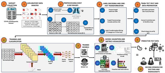 Overview of the chest X-ray classification pipeline, including preprocessing, label encoding, data splitting, model training, and evaluation.