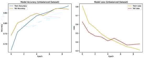 For the EfficientNetB3 architecture, the experimental evaluation was limited only to the original unbalanced dataset. This decision was mainly taken because of the large amount of computational resources that are required to train this model, due to its larger input image size of () and the use of a smaller batch size of 8. Applying data-balancing techniques such as oversampling or the Synthetic Minority Over-sampling Technique (SMOTE), which significantly increases the size of the training dataset, would have become computationally very expensive and difficult to manage. Therefore, performing the evaluation of EfficientNetB3 on the unbalanced dataset provides a strong and meaningful baseline to check the inherent efficiency and generalization capability of the model under realistic training conditions.