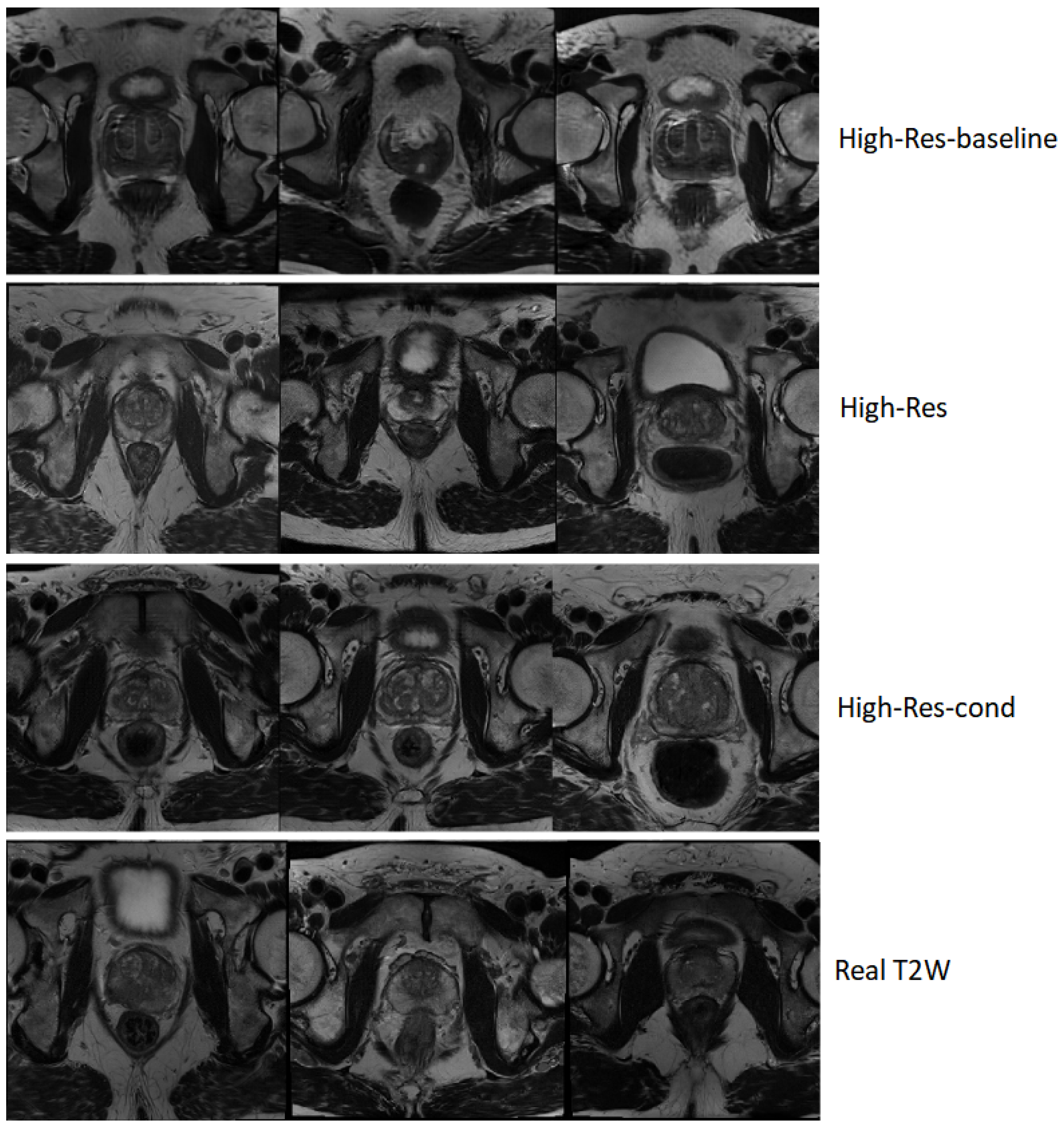 25], excluding 26 scans with severe spatial misalignment. Minor misalignments were tolerated to preserve anatomical variability. The conditional model, trained only at the highest resolution (High-Res-cond), used all 1500 volumes with csPCa labels for conditioning.