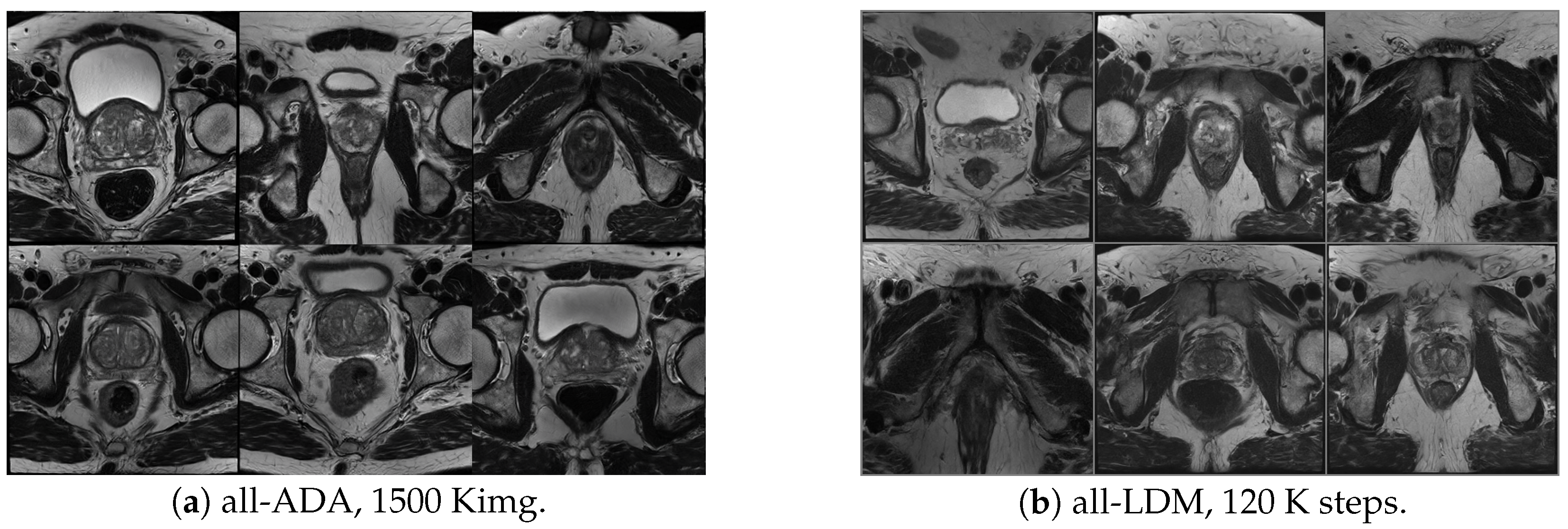 - Giardina, C.; Vilaplana, V.; Pardàs, M.; Guardia, O. Synthesis of Prostate MRI Scans: A Comparison of StyleGAN2-ADA and Latent Diffusion Models. In Proceedings of the Conferencia de la Asociación Española para la Inteligencia Artificial, IABioMed Workshop, Coruña, Spain, 19–21 June 2024. [Google Scholar]