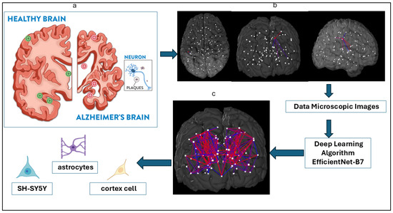 Study schematics of Alzheimer’s disease cell type detection. (a) Sketch of the brain and Alzheimer’s disease by the Fisher Center for Alzheimer’s Research Foundation. (b) Brain parcellation in sagittal, coronal, and axial views drawn from Budapest Reference Connectome version 3.0. (c) Classification of three key cell types—astrocytes, cortex cells, and SH-SY5Y cells—associated with AD using an AI-driven EfficientNet-B7 architecture applied to cell type-specific microscopic images.