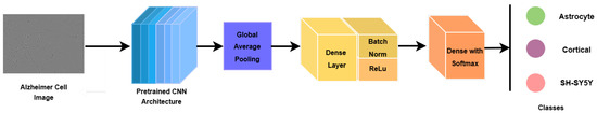 To adapt the pretrained backbones to the Alzheimer’s microscopy classification task, a lightweight task-specific classification head was appended. The extracted feature maps were first aggregated using global average pooling (GAP) to obtain a compact feature representation. This representation was passed through a fully connected layer, followed by batch normalization, ReLU activation, and dropout for regularization. A final fully connected layer with three output neurons and Softmax activation produced class probabilities for the three diagnostic categories.
