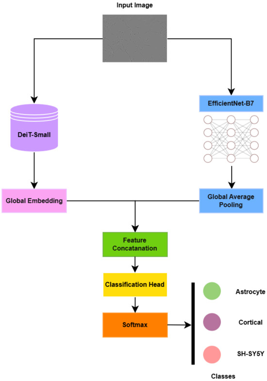 While accurate cell classification is an essential step in addressing fundamental biological questions in AD research, challenges such as low image contrast, high cell density, and limited annotated data often hinder conventional analysis [7,26]. To address this gap, the present study focuses on three key AD-related cell types—astrocytes, cortical cells, and SH-SY5Y cells—using a hybrid transformer–CNN architecture built upon EfficientNet-B7. This model integrates convolutional and attention-based mechanisms to enhance feature extraction and improve generalization in multi-class cellular image classification. Figure 1 illustrates the overall schematic of our approach.