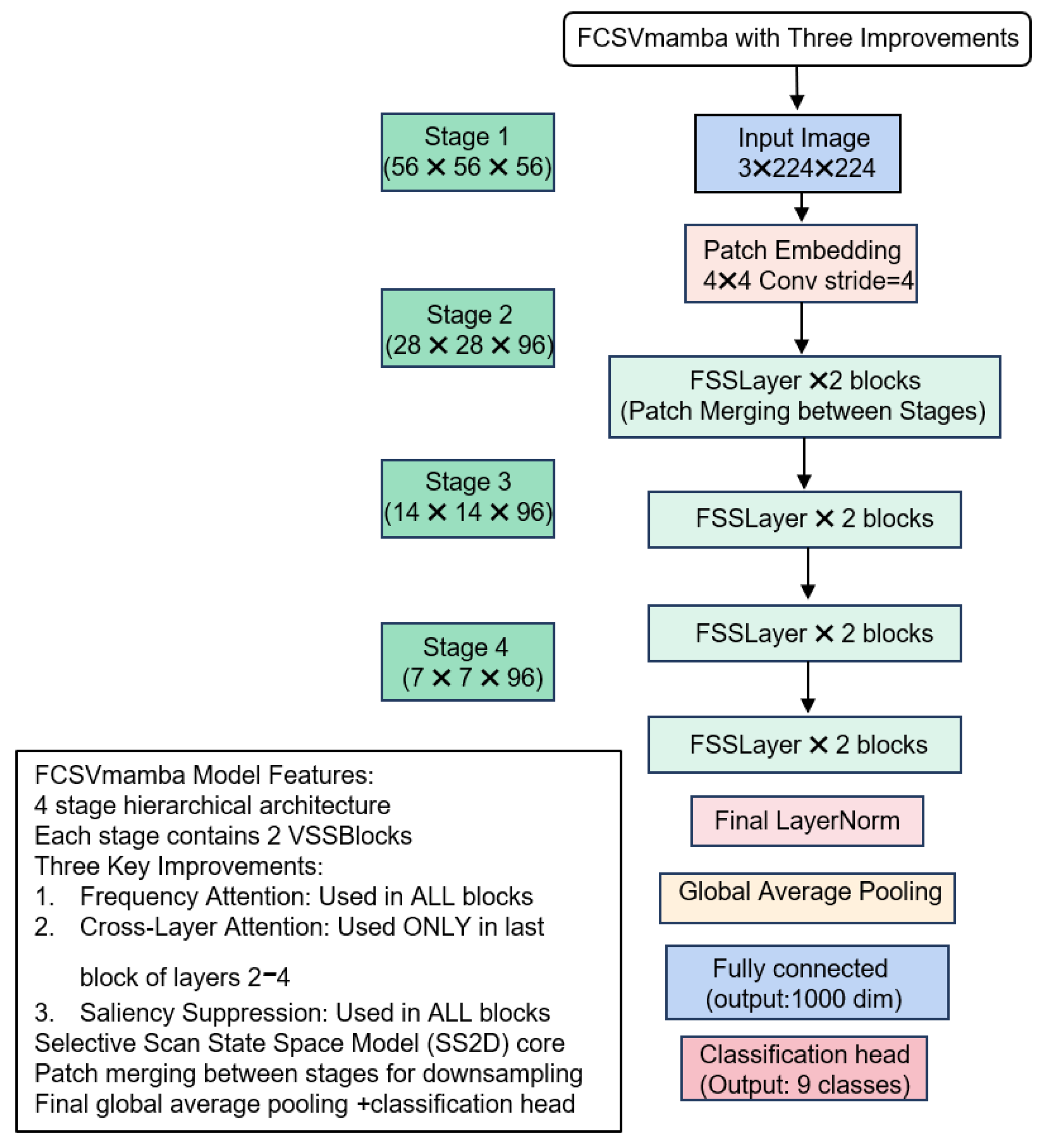 Figure 2 shows the FCS-VMamba network architecture that we independently constructed. The core components comprise Patch Embedding, an enhanced encoder (incorporating FSSLayer and Patch Merging2D), a Frequency Domain Attention module, a Salient Feature Suppression module, a Cross-Layer Cross-Attention module, a fully connected classification head, and residual connections.
