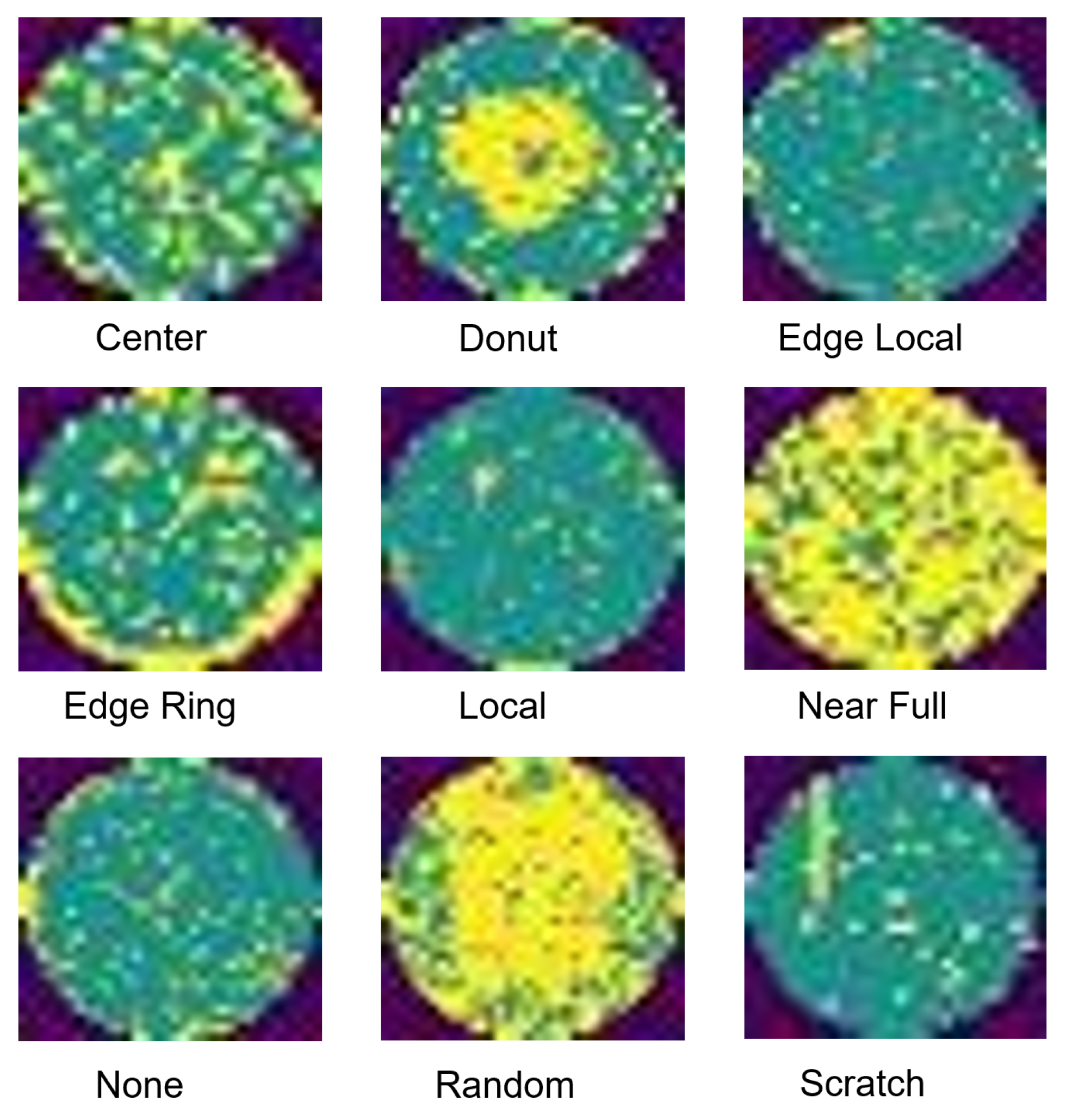 47], we randomly sampled approximately 100 images for each of the nine categories (center, donut, edge local, edge ring, local, near full, none, random, and scratch), as illustrated in