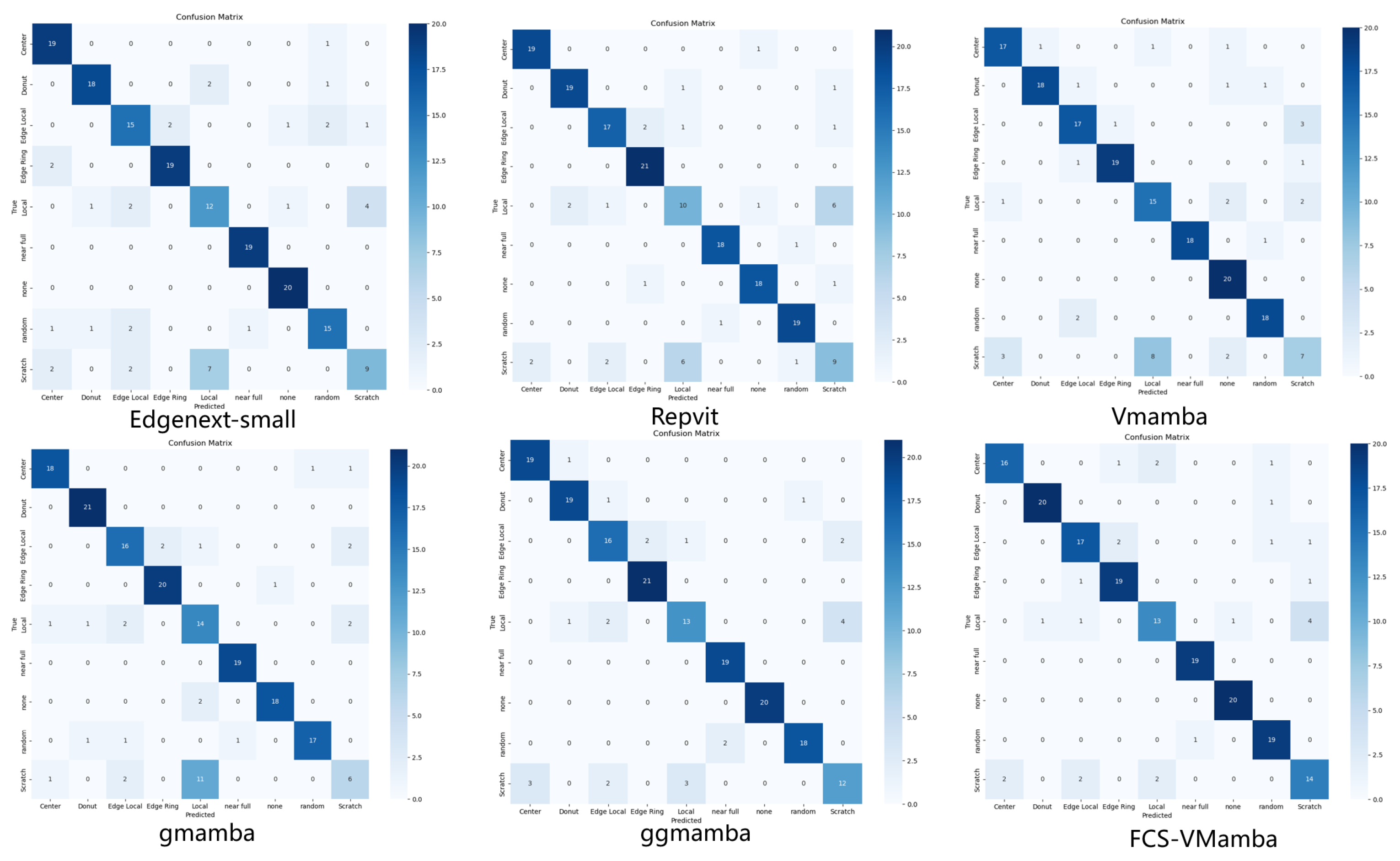 Although the theoretical FLOPs of our model were mathematically higher due to the sequential unfolding of the 2D Selective Scan (SS2D) module, it demonstrated highly competitive parameter efficiency (only 1.20M parameters). Being lightweight in industrial edge deployment is not solely dictated by FLOPs but also fundamentally constrained by the on-chip memory (SRAM) footprint. By keeping the parameters comparable to RepViT and lower than EdgeNeXt-Small, while delivering a highly practical empirical inference speed of FPS, FCS-VMamba proved to be the most optimal and balanced architecture for high-precision wafer map classification.