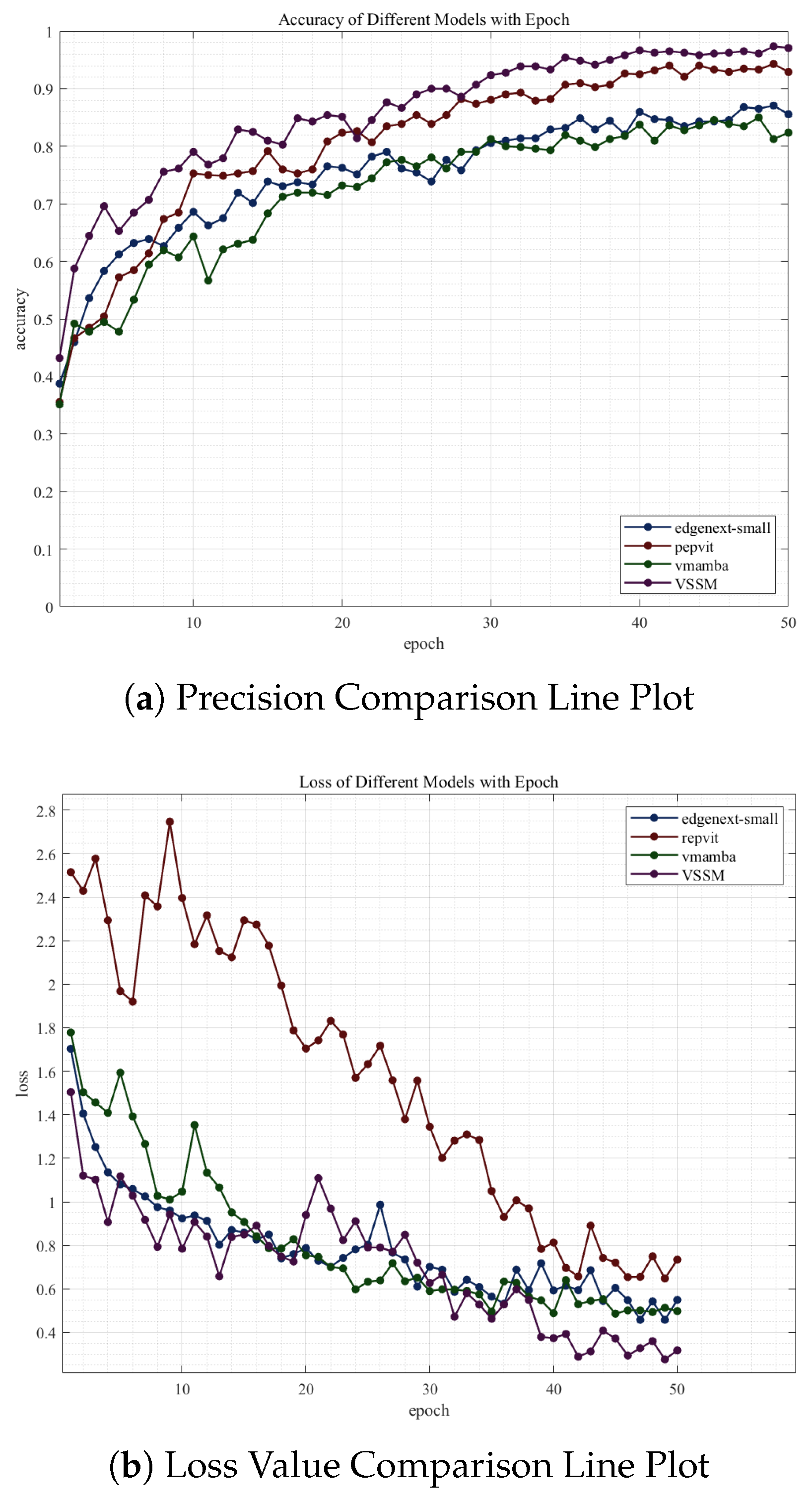 Figure 6, to provide a more intuitive assessment of the improved model’s performance, we compare the training accuracy and training loss curves of the FCS-VMamba, EdgeNeXt-Small, RepViT, and VMamba models under identical experimental conditions.