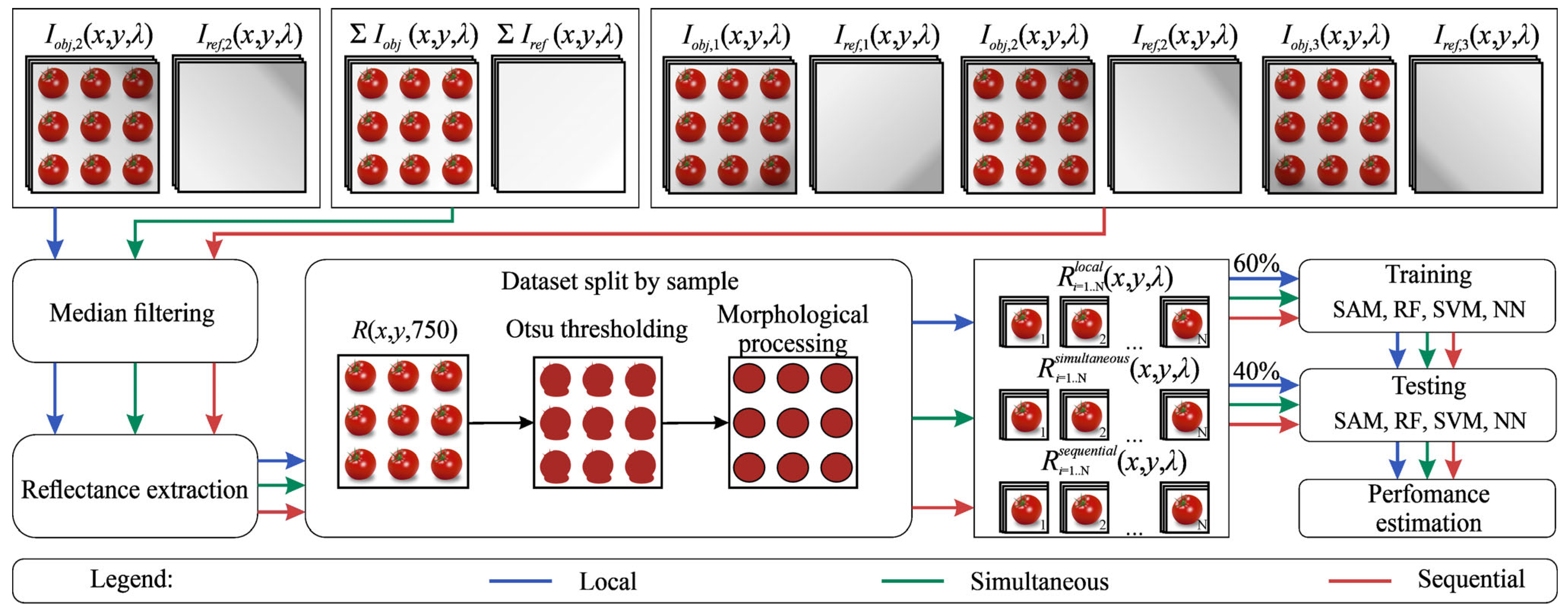 containing six study objects in the field of view into individual datasets for each object using automated binary mask generation. To create the masks, we applied thresholding to the spectral image at 750 nm, a channel that provides high contrast between the objects and the background, using Otsu’s method. We then removed noisy regions outside the objects through morphological filtering, keeping only areas containing between 20,000 and 40,000 pixels, which roughly corresponded to the frame area occupied by each object. It should be noted that the hyperspectral data were acquired as a single image containing all 24 tomatoes simultaneously within the field of view, and individual hyperspectral cubes corresponding to each tomato were extracted only during preprocessing. As a result, we obtained three datasets for each imaging mode, each consisting of 24 hyperspectral cubes. We also generated these datasets for each of the five days of the experiment. This preprocessing pipeline is shown in