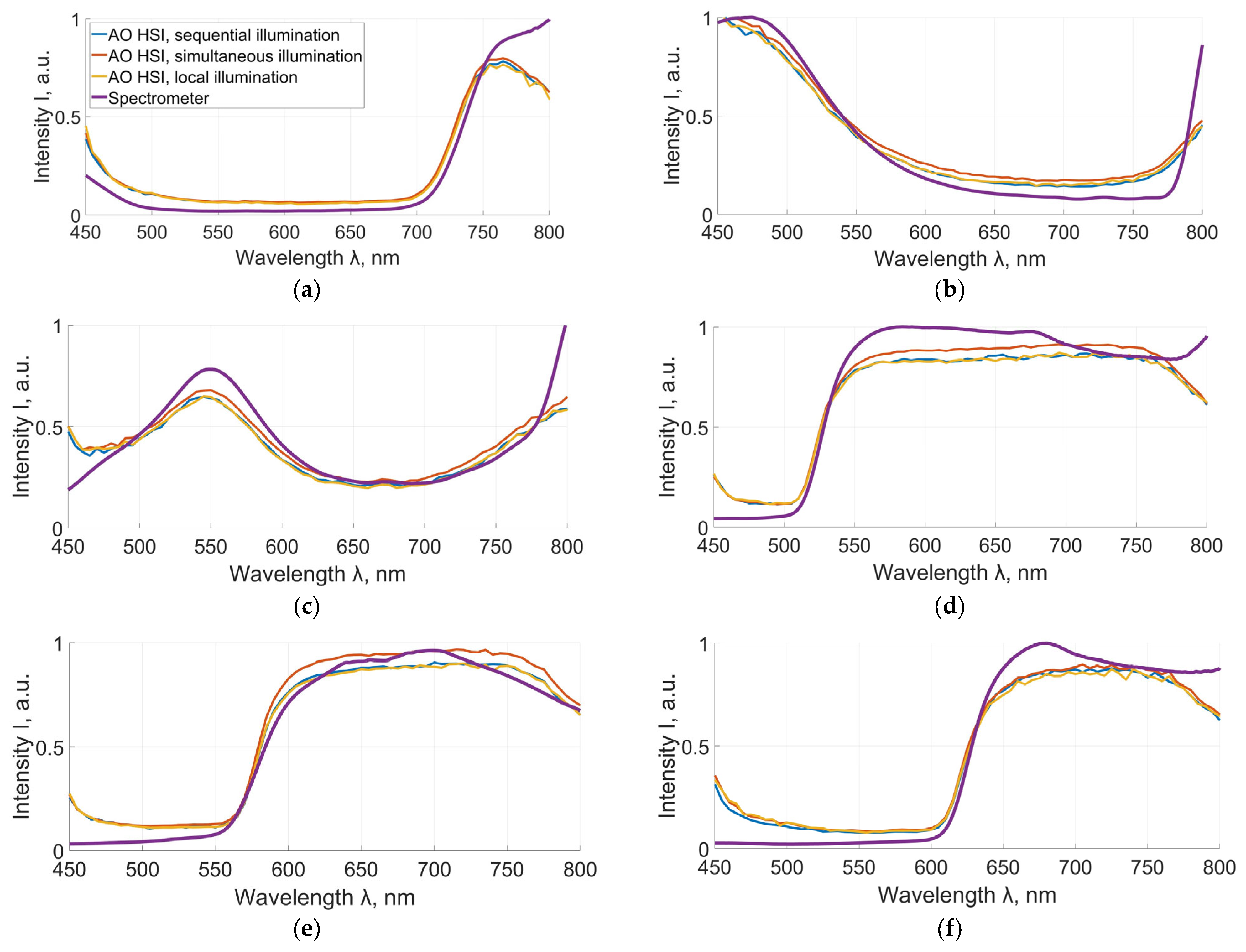 Figure 3 presents the resulting spectral curves. Comparison showed that the mean absolute deviation from the reference spectrometer spectrum was about 0.08 for sequential illumination, 0.16 for simultaneous illumination, and 0.08 for local illumination, while the corresponding RMSE values were approximately 0.10 for all three illumination modes.