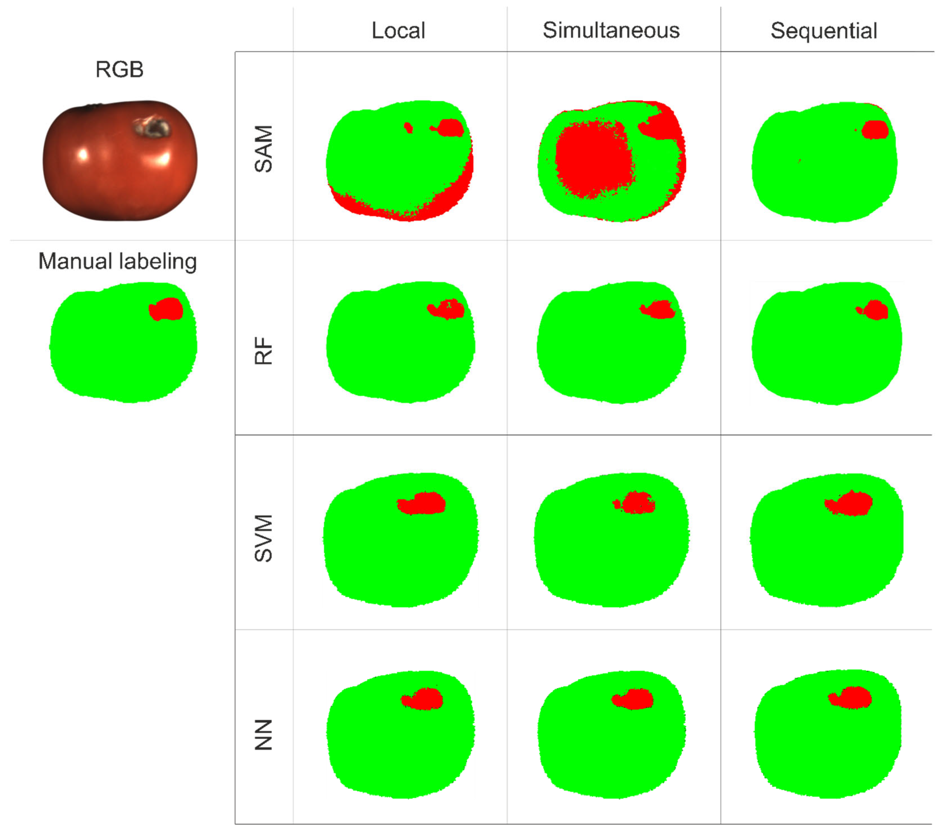 Table 2. Accuracy was highest when extracting the volume reflectance component under sequential illumination. However, high values were also noted in other illumination modes due to the imbalanced training set (27,956 defective vs. 136,267 healthy pixels). This trend was consistent for the Error Rate. The Precision metric indicated that the SAM algorithm was twice as likely as RF to classify healthy pixels as defective, but its errors significantly decreased under sequential illumination. RF demonstrated high precision across all modes, peaking under simultaneous illumination. This pattern was mirrored in the F1 metric, which combines Precision and Recall. Recall was highest for the SAM and simultaneous illumination combination. At the same time, Specificity showed RF models excelled in correctly identifying healthy pixels across all modes, with SAM performing well under sequential illumination. The IoU metric revealed the best overlap with expert annotations for SAM under sequential illumination and for RF under simultaneous illumination. When we compared different metrics for SVM and the NN, we could not give a clear recommendation on the best lighting type, because different metrics preferred different lighting regimes, and the results were mixed. However, RF achieved the highest accuracy of all methods under simultaneous illumination.