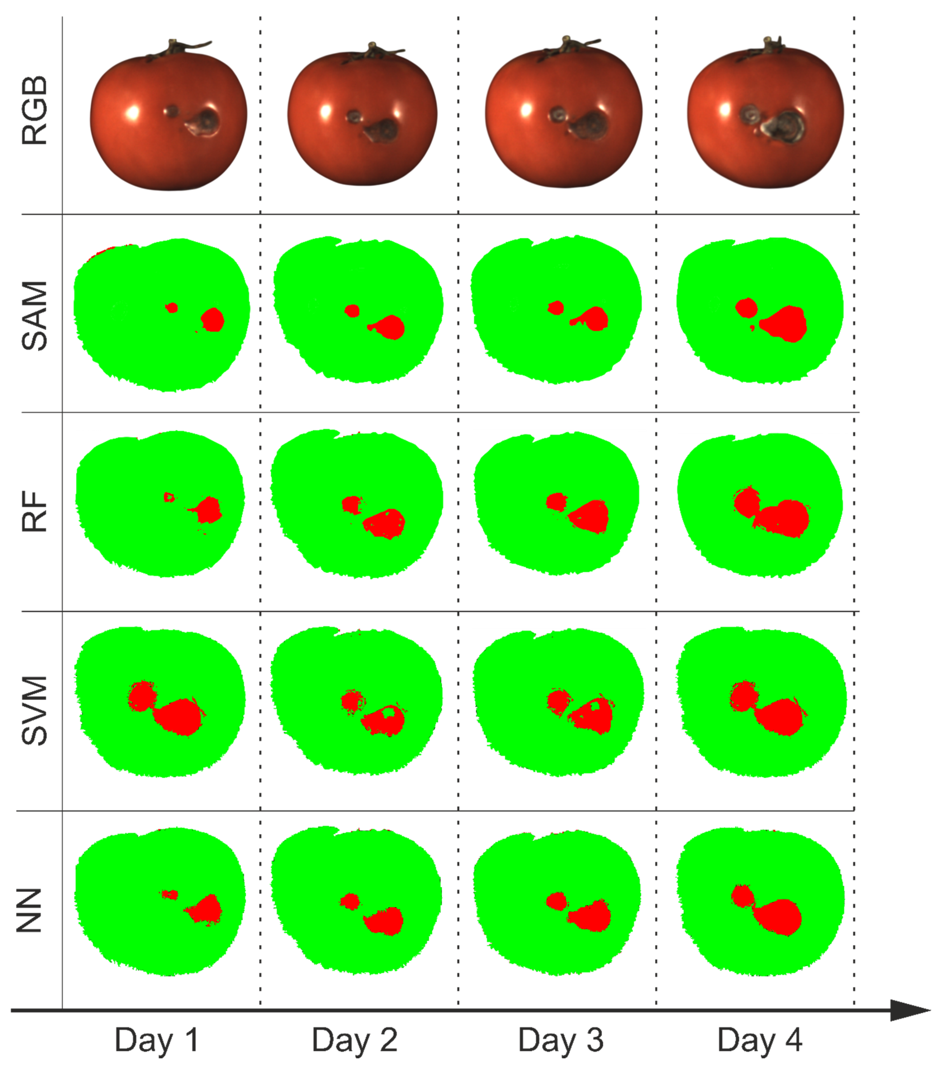 23] on a machine-vision system for tomato sorting, SVM performed best among the tested methods. Under simultaneous illumination, SVM achieved an accuracy of 0.97. In the same setup, NN reached 0.96, and RF—0.94. SAM is used for fruit defect detection [