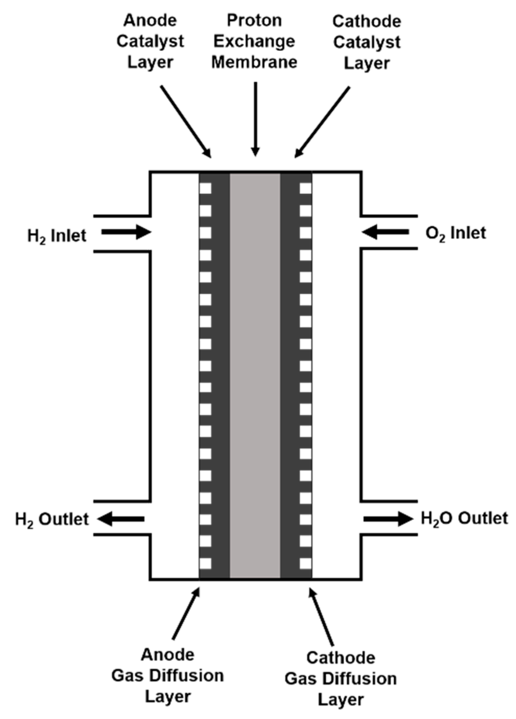 Typical structure of a Polymer Electrolyte Membrane Fuel Cell (PEMFC) showing the Membrane Electrode Assembly (MEA) and reactant and product stream flows.
